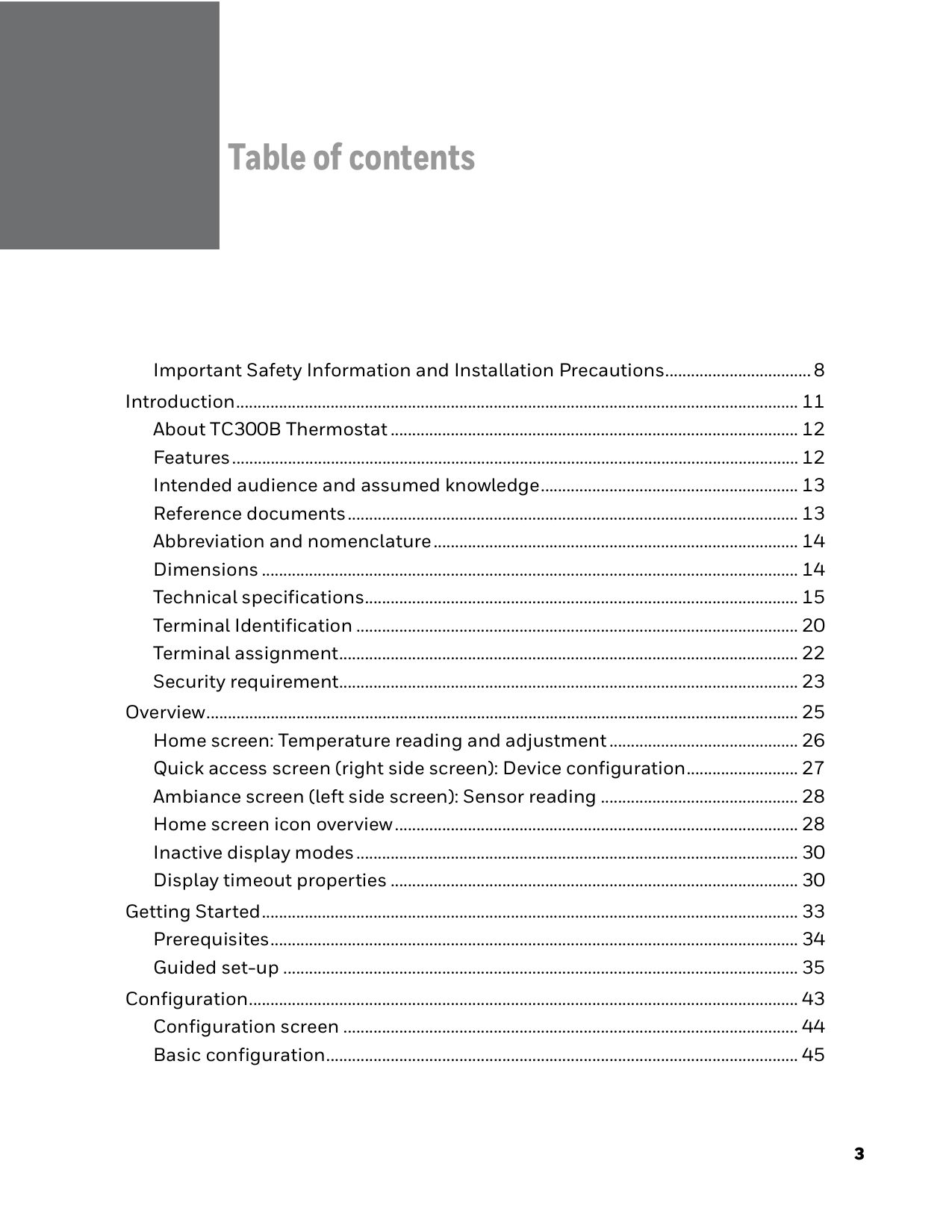 3 Table of contents Important Safety Information and Installation Precautions..................................8 Introduction................................................................................................................................... 11 About TC300B Thermostat............................................................................................... 12 Features.................................................................................................................................... 12 Intended audience and assumed knowledge............................................................ 13 Reference documents......................................................................................................... 13 Abbreviation and nomenclature..................................................................................... 14 Dimensions ............................................................................................................................. 14 Technical specifications..................................................................................................... 15 Terminal Identification ....................................................................................................... 20 Terminal assignment........................................................................................................... 22 Security requirement........................................................................................................... 23 Overview.......................................................................................................................................... 25 Home screen: Temperature reading and adjustment............................................ 26 Quick access screen (right side screen): Device configuration.......................... 27 Ambiance screen (left side screen): Sensor reading .............................................. 28 Home screen icon overview.............................................................................................. 28 Inactive display modes....................................................................................................... 30 Display timeout properties ............................................................................................... 30 Getting Started............................................................................................................................. 33 Prerequisites........................................................................................................................... 34 Guided set-up ........................................................................................................................ 35 Configuration................................................................................................................................ 43 Configuration screen .......................................................................................................... 44 Basic configuration.............................................................................................................. 45