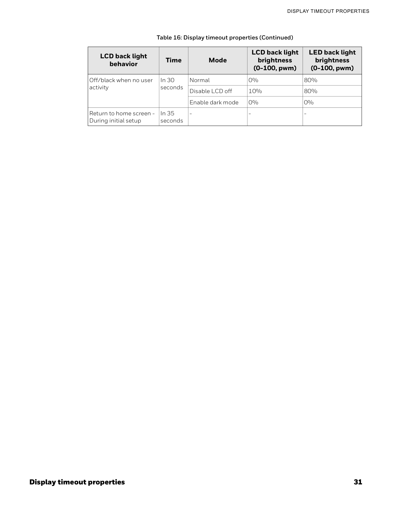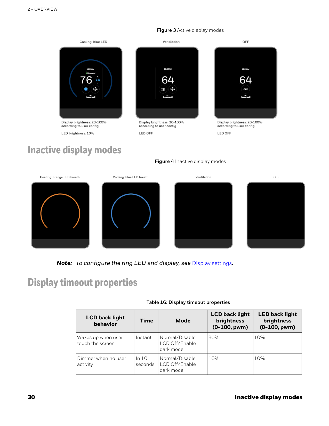 The display has automatic timeout properties: after 10 seconds of no activity, the backlight dims to 10% brightness. After 30 seconds, the display turns completely off (0% brightness) while the LED ring remains at 80% brightness to show operational status. The display will wake up instantly when you touch the screen. During initial setup, the system returns to the home screen after 35 seconds of inactivity.