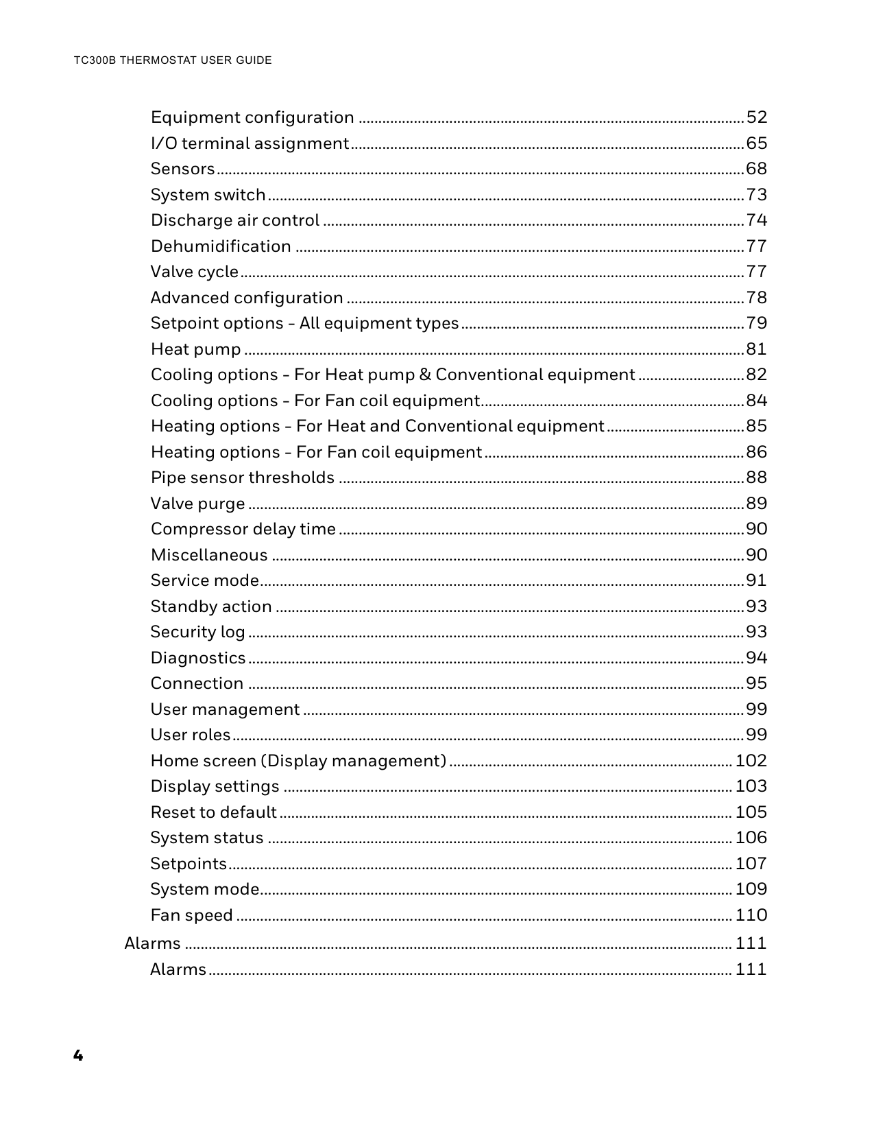 Equipment configuration ..................................................................................................52 I/O terminal assignment....................................................................................................65 Sensors......................................................................................................................................68 System switch.........................................................................................................................73 Discharge air control ...........................................................................................................74 Dehumidification ..................................................................................................................77 Valve cycle................................................................................................................................77 Advanced configuration .....................................................................................................78 Setpoint options - All equipment types........................................................................79 Heat pump ...............................................................................................................................81 Cooling options - For Heat pump & Conventional equipment ...........................82 Cooling options - For Fan coil equipment...................................................................84 Heating options - For Heat and Conventional equipment...................................85 Heating options - For Fan coil equipment..................................................................86 Pipe sensor thresholds .......................................................................................................88 Valve purge ..............................................................................................................................89 Compressor delay time .......................................................................................................90 Miscellaneous ........................................................................................................................90 Service mode...........................................................................................................................91 Standby action .......................................................................................................................93 Security log..............................................................................................................................93 Diagnostics..............................................................................................................................94 Connection ..............................................................................................................................95 User management ................................................................................................................99 User roles..................................................................................................................................99 Home screen (Display management)........................................................................ 102 Display settings ..................................................................................................................103 Reset to default................................................................................................................... 105 System status ......................................................................................................................106 Setpoints................................................................................................................................107 System mode........................................................................................................................109 Fan speed ..............................................................................................................................110 Alarms ........................................................................................................................................... 111 Alarms..................................................................................................................................... 1115