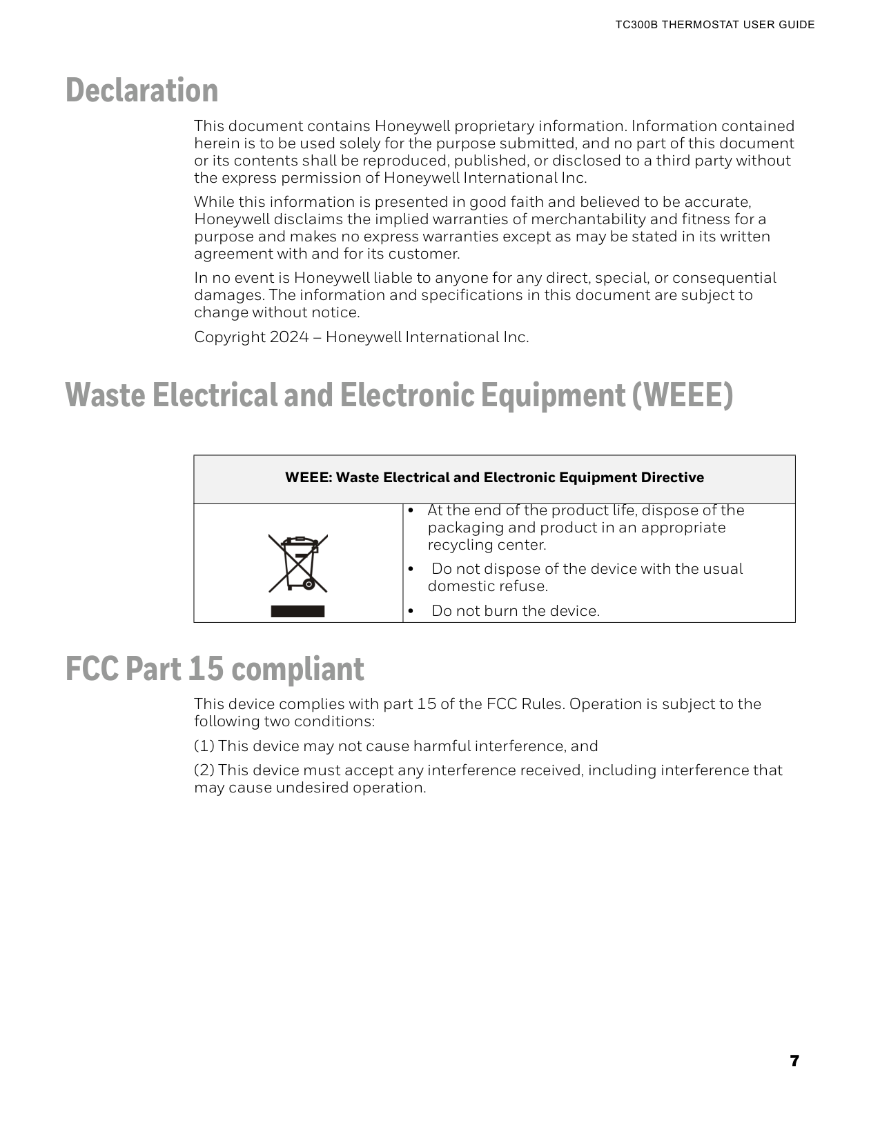 Declaration This document contains Honeywell proprietary information. Information contained herein is to be used solely for the purpose submitted, and no part of this document or its contents shall be reproduced, published, or disclosed to a third party without the express permission of Honeywell International Inc. While this information is presented in good faith and believed to be accurate, Honeywell disclaims the implied warranties of merchantability and fitness for a purpose and makes no express warranties except as may be stated in its written agreement with and for its customer. In no event is Honeywell liable to anyone for any direct, special, or consequential damages. The information and specifications in this document are subject to change without notice. Copyright 2024 – Honeywell International Inc. Waste Electrical and Electronic Equipment (WEEE) FCC Part 15 compliant This device complies with part 15 of the FCC Rules. Operation is subject to the following two conditions: (1) This device may not cause harmful interference, and (2) This device must accept any interference received, including interference that may cause undesired operation. WEEE: Waste Electrical and Electronic Equipment Directive • At the end of the product life, dispose of the packaging and product in an appropriate recycling center. • Do not dispose of the device with the usual domestic refuse. • Do not burn the device.8 Important Safety Information and Installation Precautions