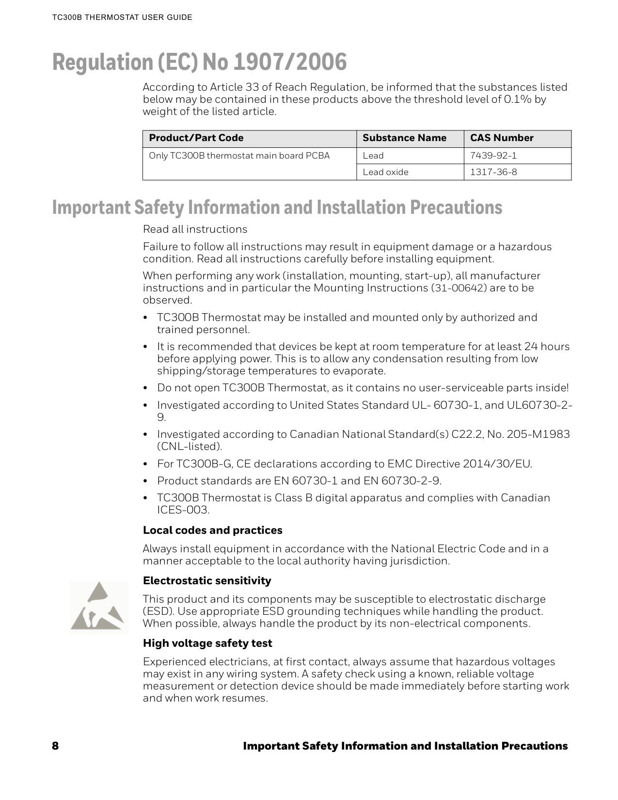 Local codes and practices Always install equipment in accordance with the National Electric Code and in a manner acceptable to the local authority having jurisdiction. Electrostatic sensitivity This product and its components may be susceptible to electrostatic discharge (ESD). Use appropriate ESD grounding techniques while handling the product. When possible, always handle the product by its non-electrical components. High voltage safety test Experienced electricians, at first contact, always assume that hazardous voltages may exist in any wiring system. A safety check using a known, reliable voltage measurement or detection device should be made immediately before starting work and when work resumes. Product/Part Code Substance Name CAS Number Only TC300B thermostat main board PCBA Lead 7439-92-1 Lead oxide 1317-36-8Important Safety Information and Installation Precautions 9
