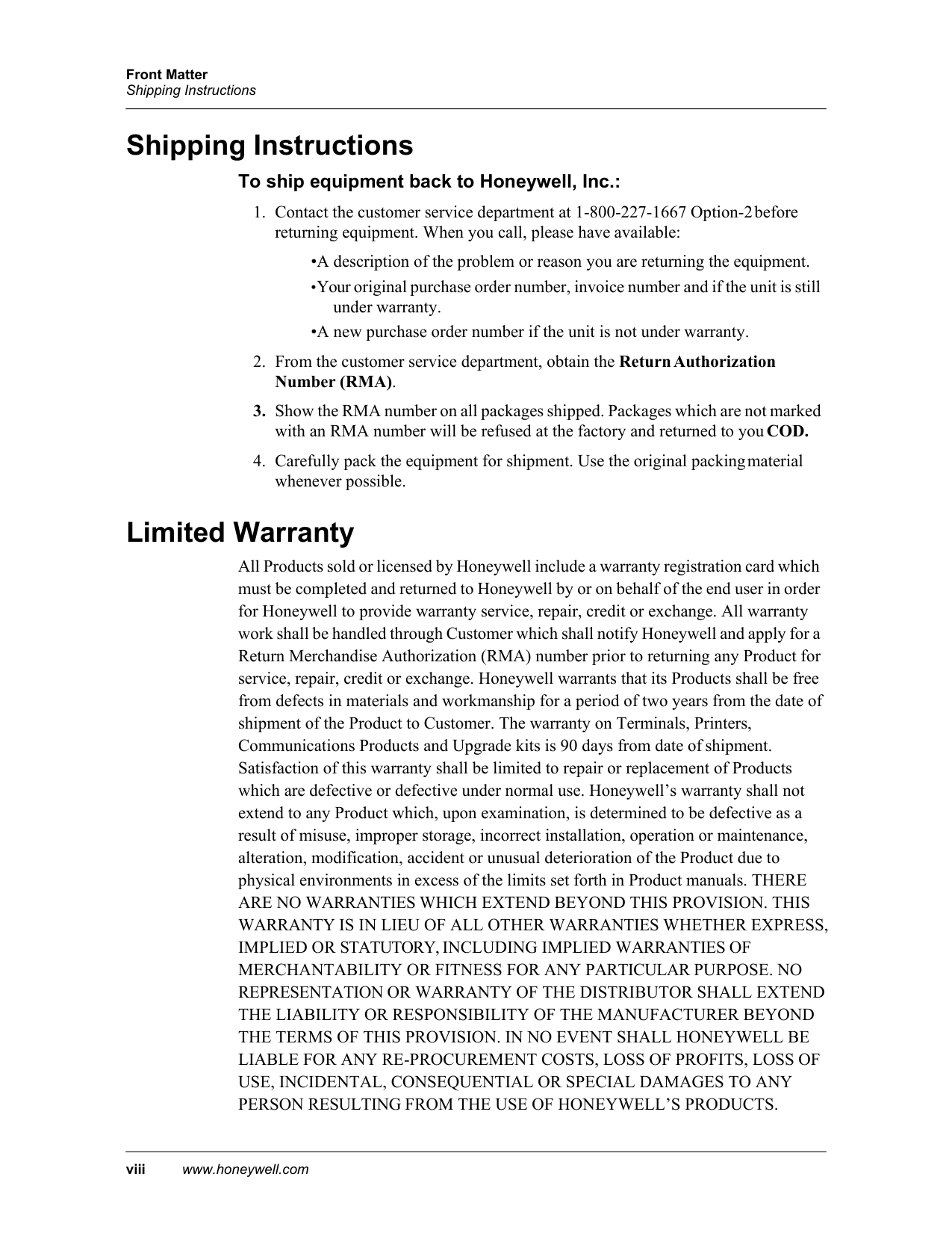 Limited Warranty All Products sold or licensed by Honeywell include a warranty registration card which must be completed and returned to Honeywell by or on behalf of the end user in order for Honeywell to provide warranty service, repair, credit or exchange. All warranty work shall be handled through Customer which shall notify Honeywell and apply for a Return Merchandise Authorization (RMA) number prior to returning any Product for service, repair, credit or exchange. Honeywell warrants that its Products shall be free from defects in materials and workmanship for a period of two years from the date of shipment of the Product to Customer. The warranty on Terminals, Printers, Communications Products and Upgrade kits is 90 days from date of shipment. Satisfaction of this warranty shall be limited to repair or replacement of Products which are defective or defective under normal use. Honeywell’s warranty shall not extend to any Product which, upon examination, is determined to be defective as a result of misuse, improper storage, incorrect installation, operation or maintenance, alteration, modification, accident or unusual deterioration of the Product due to physical environments in excess of the limits set forth in Product manuals. THERE