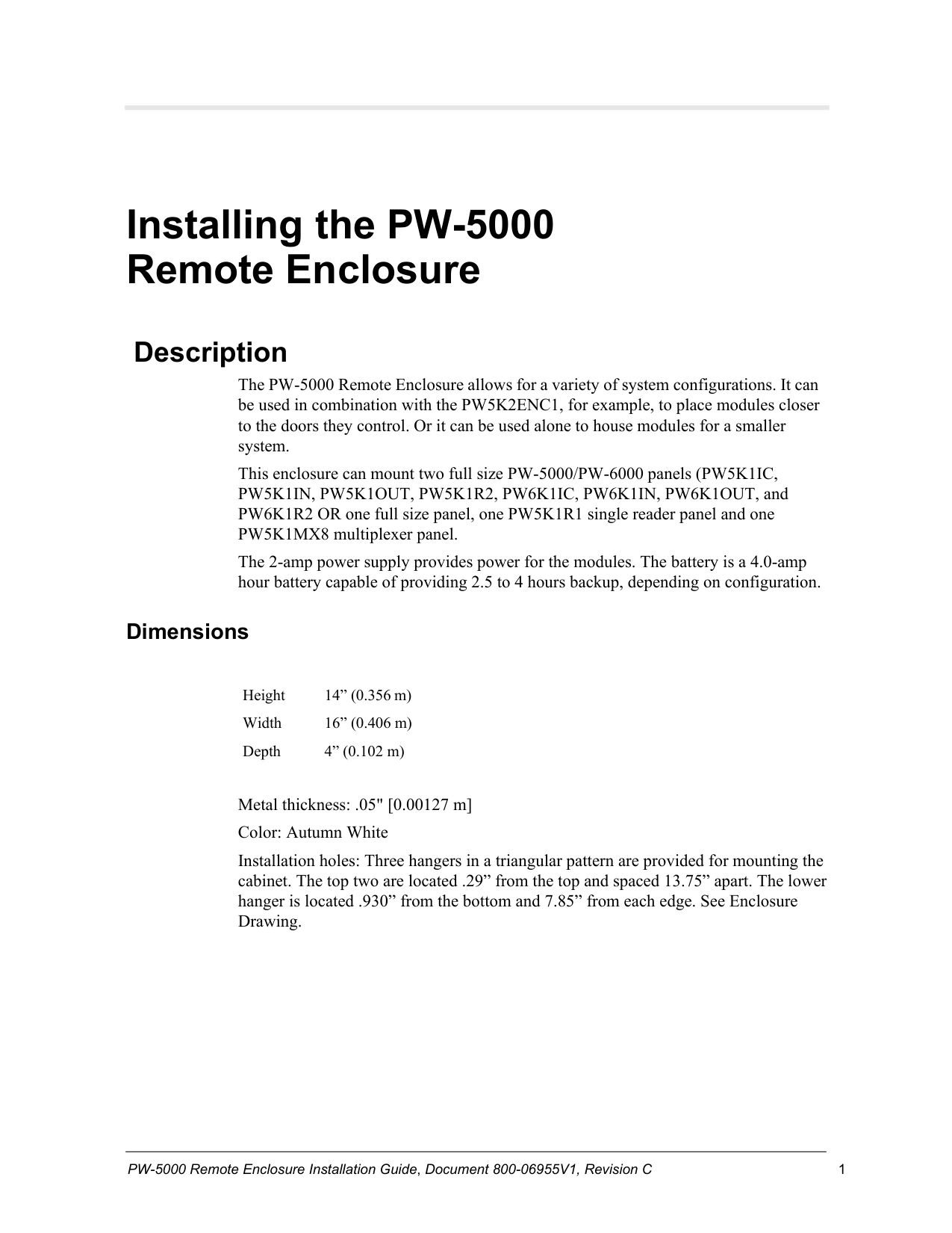 PW-5000 Remote Enclosure Installation Guide, Document 800-06955V1, Revision C 1
