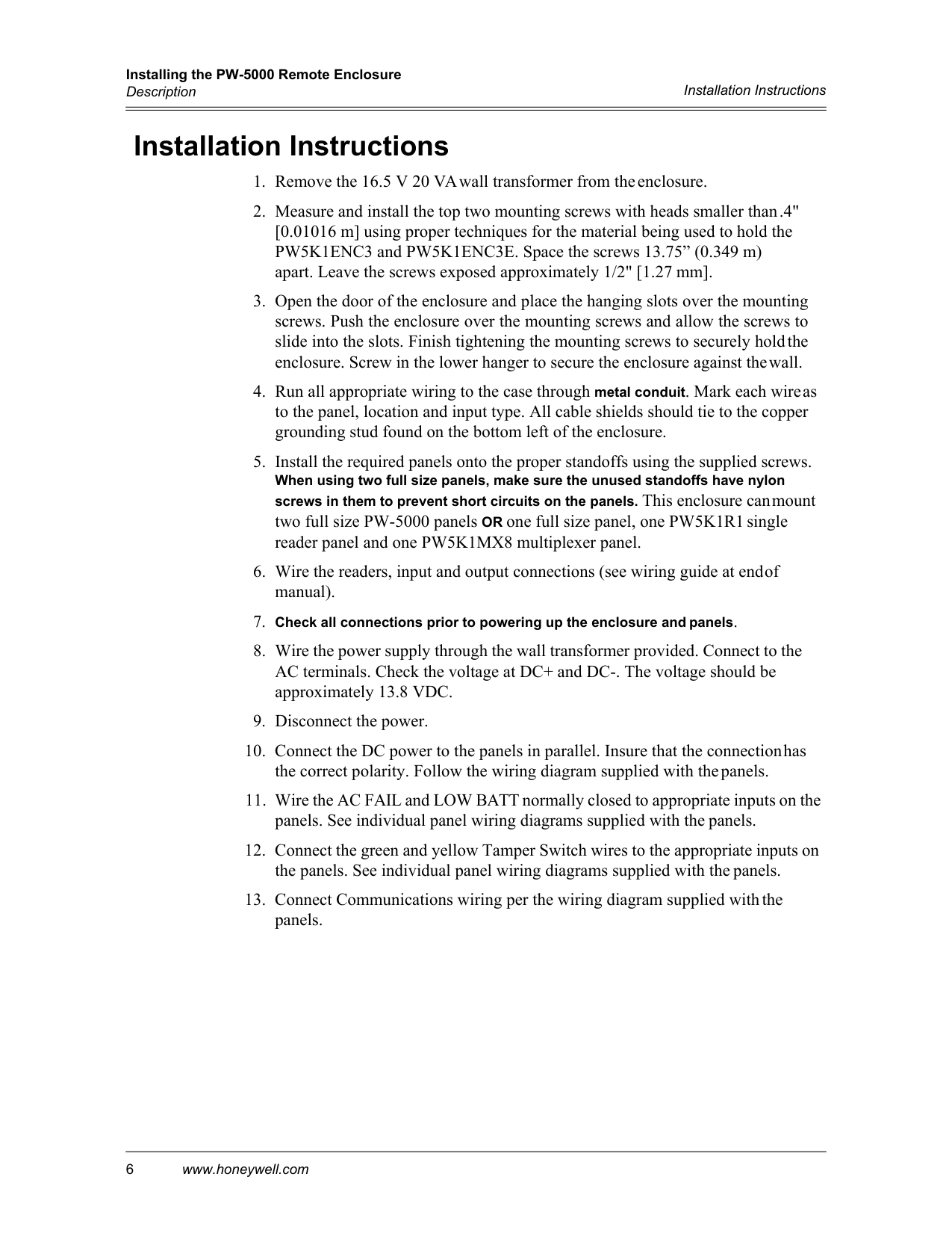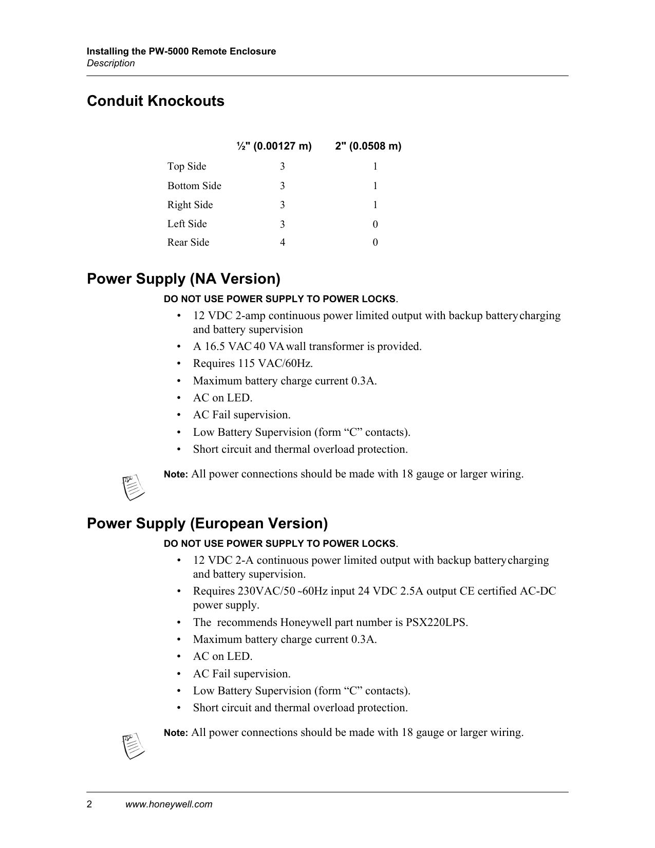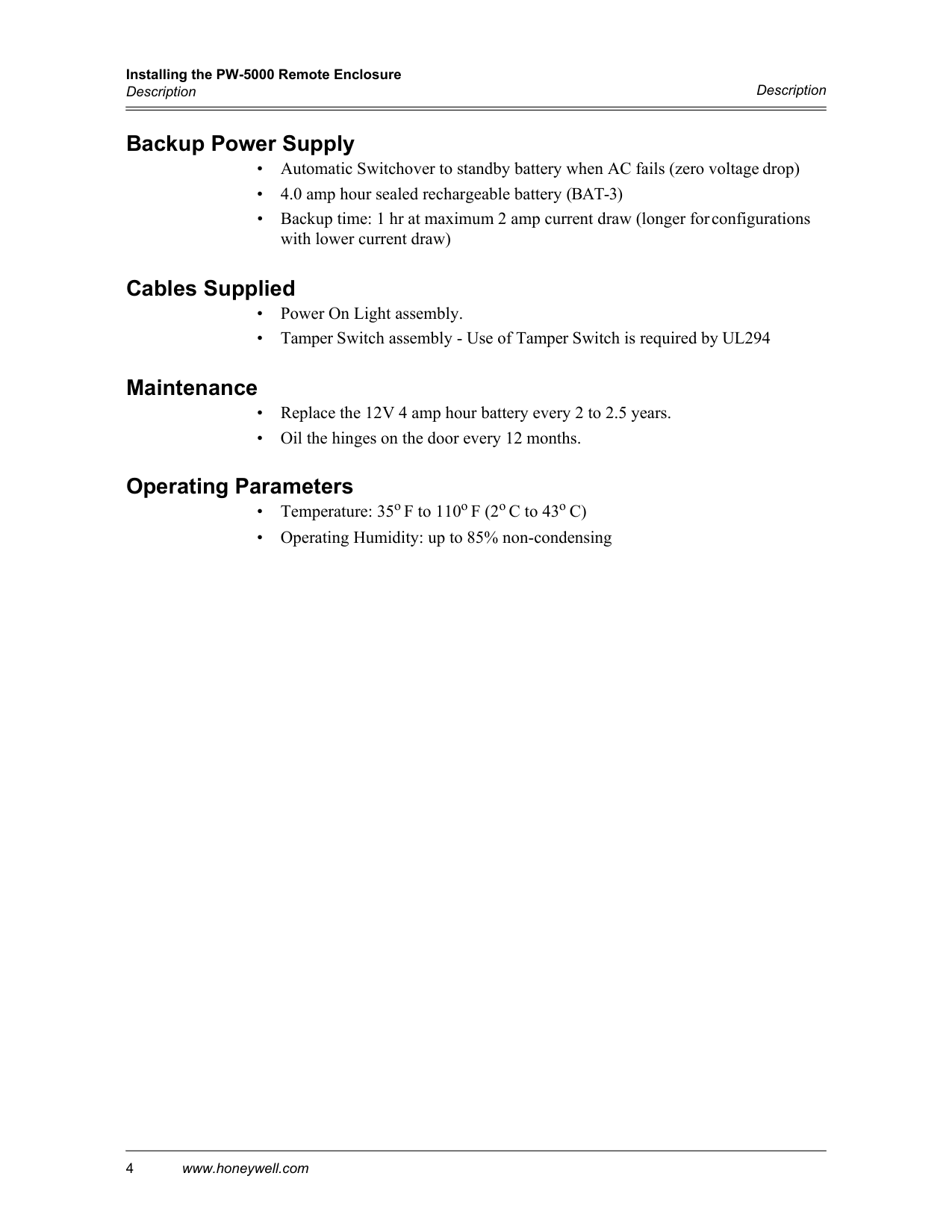 Loss of AC, discharged or no standby battery, no DC outputInstalling the PW-5000 Remote Enclosure Description 4 www.honeywell.com