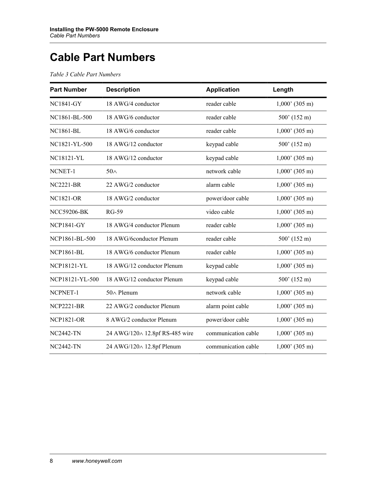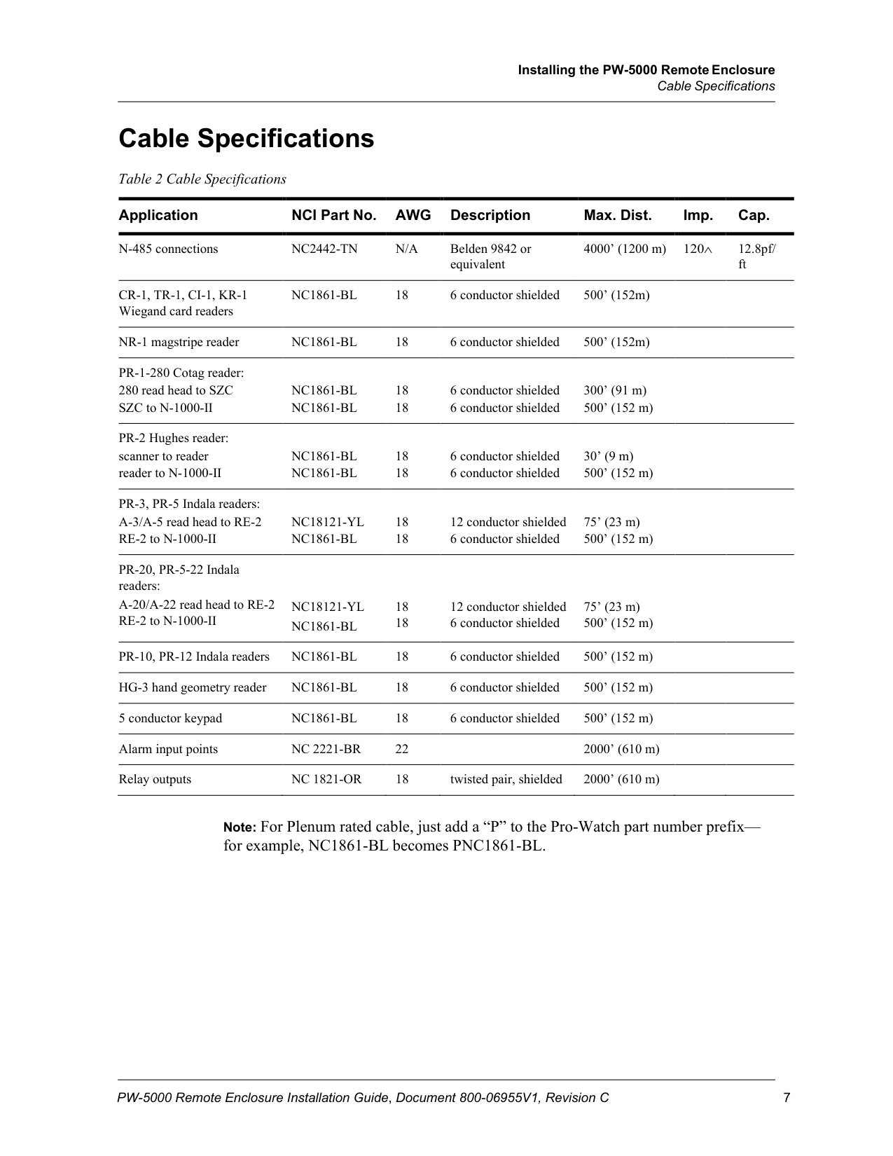 Installing the PW-5000 Remote Enclosure Cable Specifications PW-5000 Remote Enclosure Installation Guide, Document 800-06955V1, Revision C 7