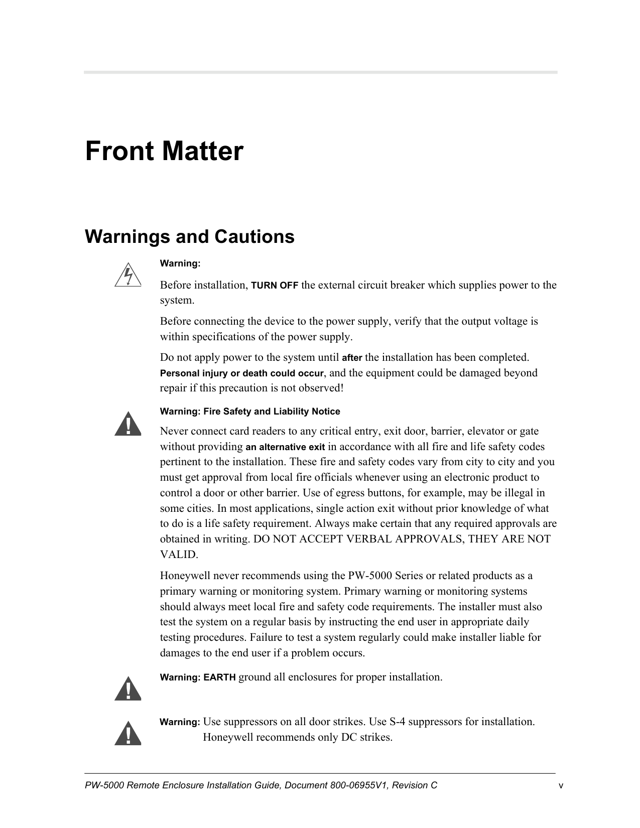 Honeywell never recommends using the PW-5000 Series or related products as a primary warning or monitoring system. Primary warning or monitoring systems should always meet local fire and safety code requirements. The installer must also test the system on a regular basis by instructing the end user in appropriate daily testing procedures. Failure to test a system regularly could make installer liable for damages to the end user if a problem occurs. Warning: EARTH ground all enclosures for proper installation.Warning: Use suppressors on all door strikes. Use S-4 suppressors for installation. Honeywell recommends only DC strikes.