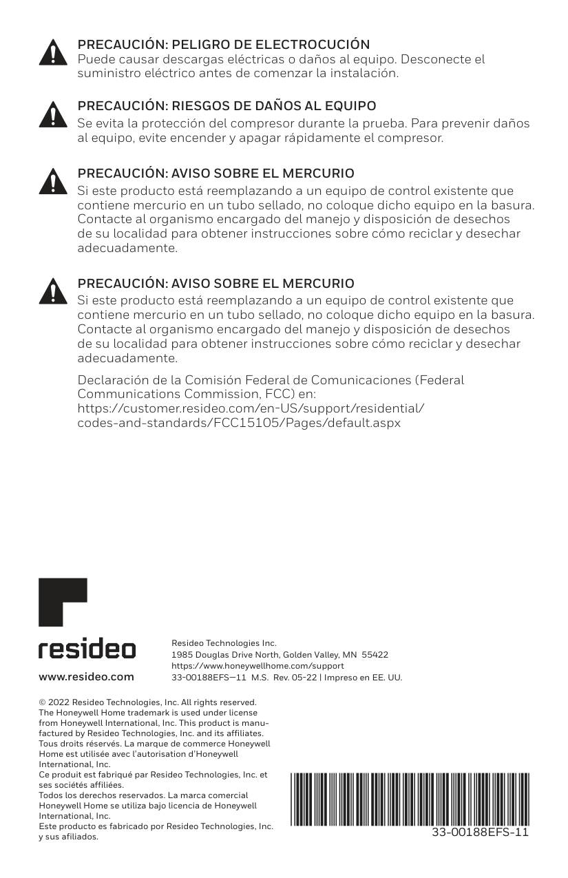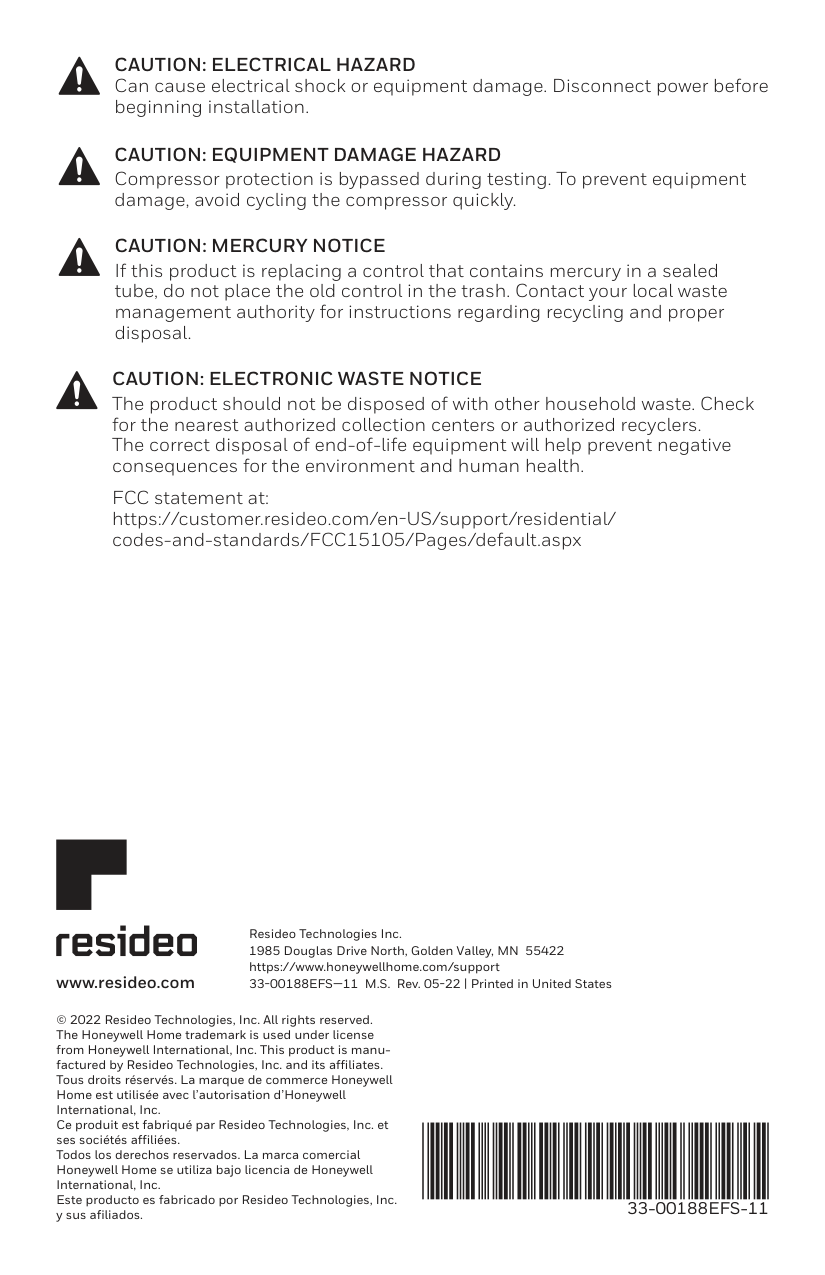 Resideo Technologies Inc. 1985 Douglas Drive North, Golden Valley, MN 55422 https://www.honeywellhome.com/support 33-00188EFS—11 M.S. Rev. 05-22 | Printed in United States www.resideo.com © 2022 Resideo Technologies, Inc. All rights reserved. The Honeywell Home trademark is used under license from Honeywell International, Inc. This product is manu- factured by Resideo Technologies, Inc. and its affiliates. Tous droits réservés. La marque de commerce Honeywell Home est utilisée avec l’autorisation d’Honeywell International, Inc. Ce produit est fabriqué par Resideo Technologies, Inc. et ses sociétés affiliées. Todos los derechos reservados. La marca comercial Honeywell Home se utiliza bajo licencia de Honeywell International, Inc. Este producto es fabricado por Resideo Technologies, Inc. y sus afiliados.