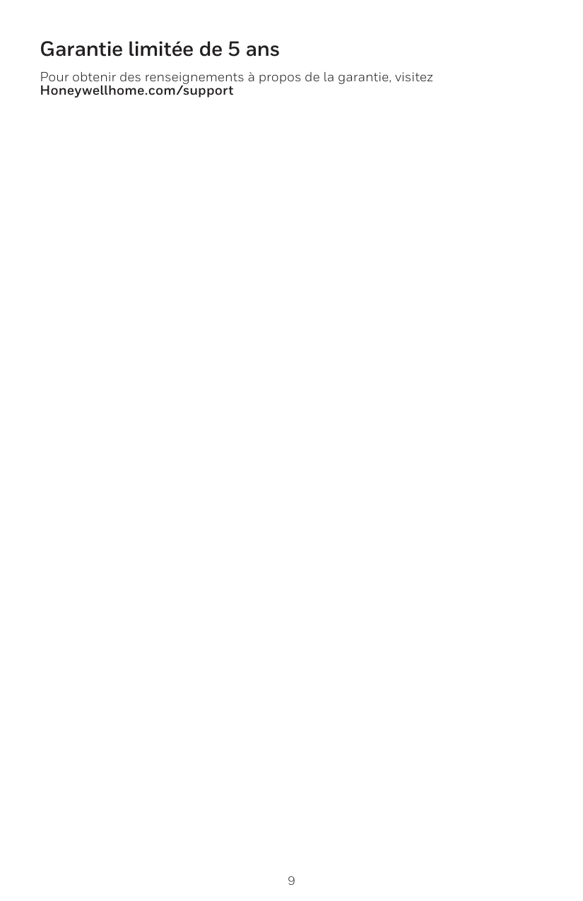 9 Pour obtenir des renseignements à propos de la garantie, visitez Honeywellhome.com/support Garantie limitée de 5 ans