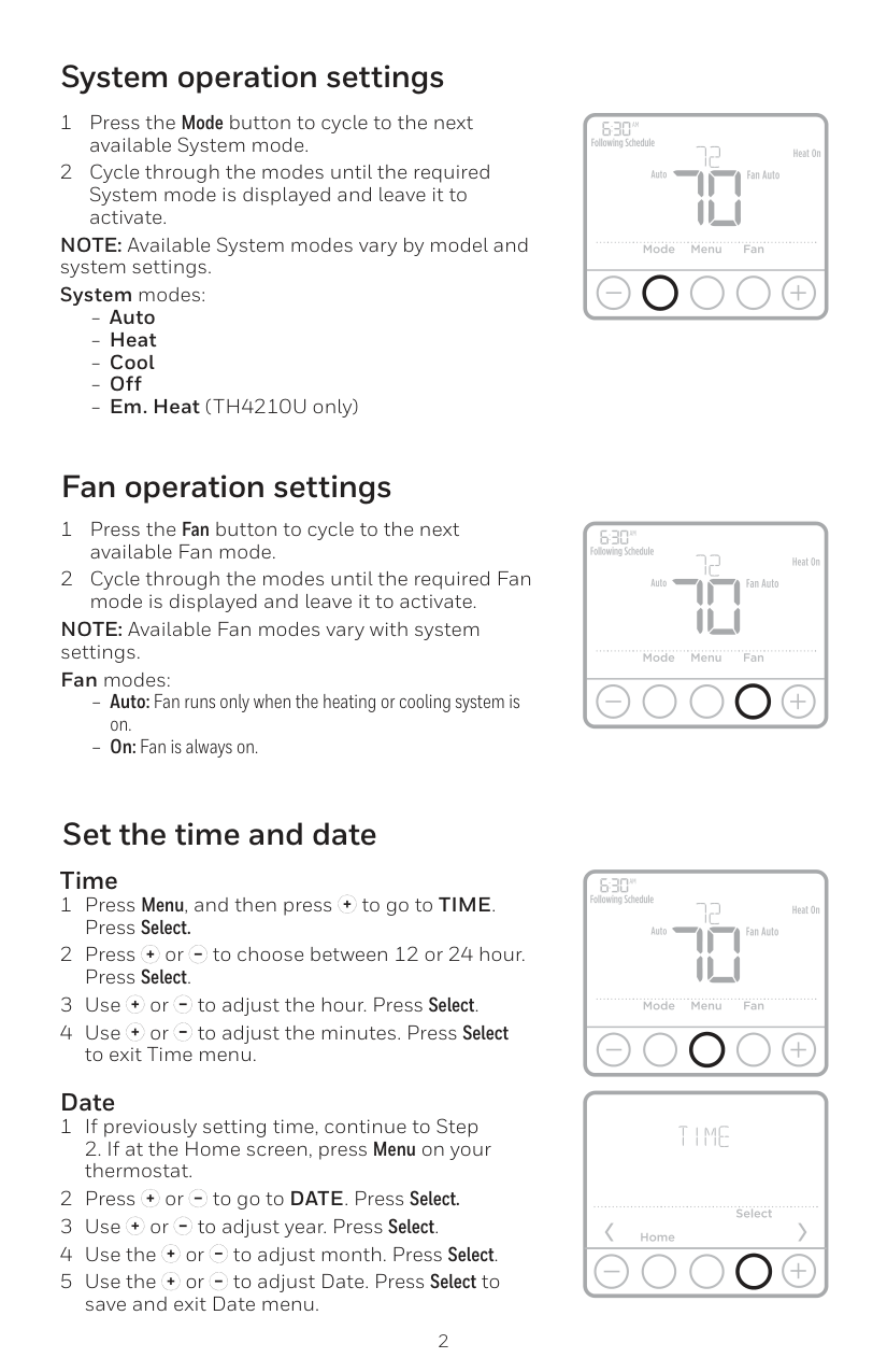 User Guide For assistance with this product, please visit Honeywellhome.com/support Customer assistance Thermostat controls2 System operation settings 1 Press the Mode button to cycle to the next available System mode. 2 Cycle through the modes until the required System mode is displayed and leave it to activate. NOTE: Available System modes vary by model and system settings. System modes: ‒ Auto ‒ Heat ‒ Cool ‒ Off ‒ Em. Heat (TH4210U only) Set the time and date Time 1 Press Menu, and then press to go to TIME. Press Select. 2 Press or to choose between 12 or 24 hour. Press Select. 3 Use or to adjust the hour. Press Select. 4 Use or to adjust the minutes. Press Select to exit Time menu. Date 1 If previously setting time, continue to Step