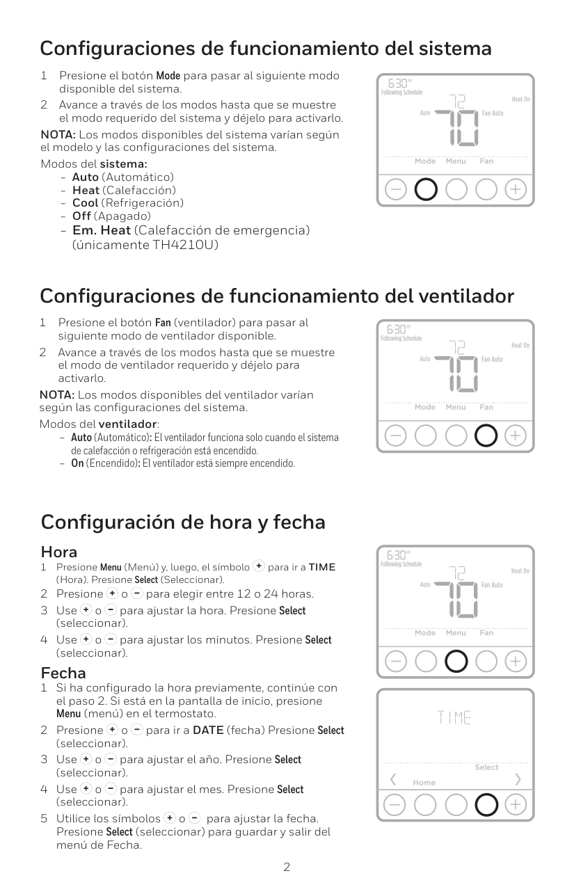 Guía del usuario El paquete incluye:2 Configuraciones de funcionamiento del sistema 1 Presione el botón Mode para pasar al siguiente modo disponible del sistema. 2 Avance a través de los modos hasta que se muestre el modo requerido del sistema y déjelo para activarlo. NOTA: Los modos disponibles del sistema varían según el modelo y las configuraciones del sistema. Modos del sistema: ‒ Auto (Automático) ‒ Heat (Calefacción) ‒ Cool (Refrigeración) ‒ Off (Apagado) ‒ Em. Heat (Calefacción de emergencia) (únicamente TH4210U) Configuración de hora y fecha Hora 1 Presione Menu (Menú) y, luego, el símbolo para ir a TIME (Hora). Presione Select (Seleccionar). 2 Presione o para elegir entre 12 o 24 horas. 3 Use o para ajustar la hora. Presione Select (seleccionar). 4 Use o para ajustar los minutos. Presione Select (seleccionar). Fecha 1 Si ha configurado la hora previamente, continúe con el paso 2. Si está en la pantalla de inicio, presione Menu (menú) en el termostato. 2 Presione o para ir a DATE (fecha) Presione Select (seleccionar). 3 Use o para ajustar el año. Presione Select (seleccionar). 4 Use o para ajustar el mes. Presione Select (seleccionar). 5 Utilice los símbolos o para ajustar la fecha. Presione Select (seleccionar) para guardar y salir del menú de Fecha. Configuraciones de funcionamiento del ventilador 1 Presione el botón Fan (ventilador) para pasar al siguiente modo de ventilador disponible. 2 Avance a través de los modos hasta que se muestre el modo de ventilador requerido y déjelo para activarlo. NOTA: Los modos disponibles del ventilador varían según las configuraciones del sistema. Modos del ventilador: ‒ Auto (Automático): El ventilador funciona solo cuando el sistema de calefacción o refrigeración está encendido. ‒ On (Encendido): El ventilador está siempre encendido.