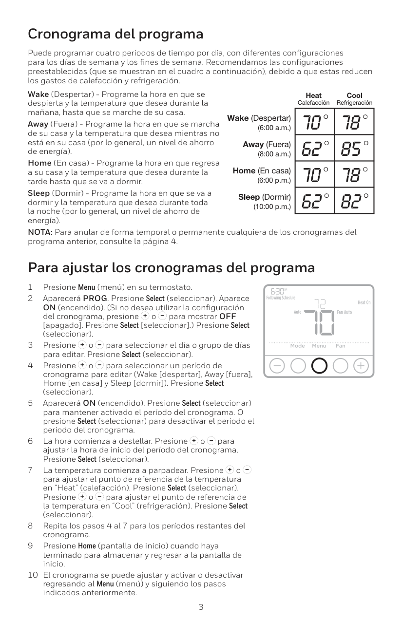 para ajustar el punto de referencia de la temperatura en “Heat” (calefacción). Presione Select (seleccionar). Presione o para ajustar el punto de referencia de la temperatura en “Cool” (refrigeración). Presione Select (seleccionar). 8 Repita los pasos 4 al 7 para los períodos restantes del cronograma. 9 Presione Home (pantalla de inicio) cuando haya terminado para almacenar y regresar a la pantalla de inicio. 10 El cronograma se puede ajustar y activar o desactivar regresando al Menu (menú) y siguiendo los pasos indicados anteriormente. Heat Cool Wake (Despertar) (6:00 a.m.) 70 ° 78 ° Away (Fuera) (8:00 a.m.) 62 ° 85 ° Home (En casa) (6:00 p.m.) 70 ° 78 ° Sleep (Dormir) (10:00 p.m.) 62 ° 82 ° Calefacción Refrigeración