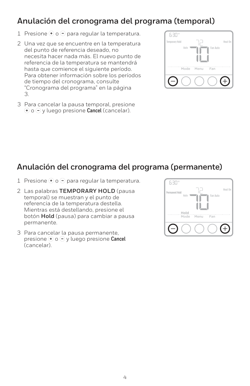 and then press Cancel. 1 Press or to adjust the temperature. 2 TEMPORARY HOLD is displayed and the setpoint temperature flashes. While it’s flashing, press Hold (Mode) button to change to Permanent Hold. 3 To cancel the Permanent Hold, press or