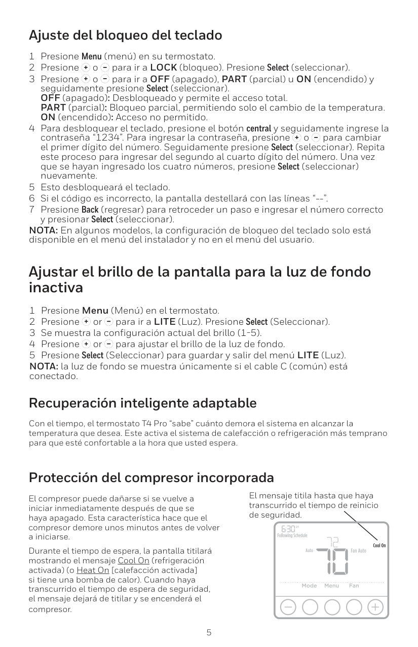 5 Recuperación inteligente adaptable Con el tiempo, el termostato T4 Pro “sabe” cuánto demora el sistema en alcanzar la temperatura que desea. Este activa el sistema de calefacción o refrigeración más temprano para que esté confortable a la hora que usted espera. El compresor puede dañarse si se vuelve a iniciar inmediatamente después de que se haya apagado. Esta característica hace que el compresor demore unos minutos antes de volver a iniciarse. Durante el tiempo de espera, la pantalla titilará mostrando el mensaje Cool On (refrigeración activada) (o Heat On [calefacción activada] si tiene una bomba de calor). Cuando haya transcurrido el tiempo de espera de seguridad, el mensaje dejará de titilar y se encenderá el compresor. Protección del compresor incorporada El mensaje titila hasta que haya transcurrido el tiempo de reinicio de seguridad. Ajuste del bloqueo del teclado 1 Presione Menu (menú) en su termostato. 2 Presione o para ir a LOCK (bloqueo). Presione Select (seleccionar). 3 Presione o para ir a OFF (apagado), PART (parcial) u ON (encendido) y seguidamente presione Select (seleccionar). OFF (apagado): Desbloqueado y permite el acceso total. PART (parcial): Bloqueo parcial, permitiendo solo el cambio de la temperatura. ON (encendido): Acceso no permitido. 4 Para desbloquear el teclado, presione el botón central y seguidamente ingrese la contraseña “1234”. Para ingresar la contraseña, presione o para cambiar el primer dígito del número. Seguidamente presione Select (seleccionar). Repita este proceso para ingresar del segundo al cuarto dígito del número. Una vez que se hayan ingresado los cuatro números, presione Select (seleccionar) nuevamente. 5 Esto desbloqueará el teclado. 6 Si el código es incorrecto, la pantalla destellará con las líneas “--”. 7 Presione Back (regresar) para retroceder un paso e ingresar el número correcto y presionar Select (seleccionar). NOTA: En algunos modelos, la configuración de bloqueo del teclado solo está disponible en el menú del instalador y no en el menú del usuario. Ajustar el brillo de la pantalla para la luz de fondo inactiva 1 Presione Menu (Menú) en el termostato. 2 Presione or para ir a LITE (Luz). Presione Select (Seleccionar). 3 Se muestra la configuración actual del brillo (1-5). 4 Presione or para ajustar el brillo de la luz de fondo. 5 Presione Select (Seleccionar) para guardar y salir del menú LITE (Luz). NOTA: la luz de fondo se muestra únicamente si el cable C (común) está conectado.