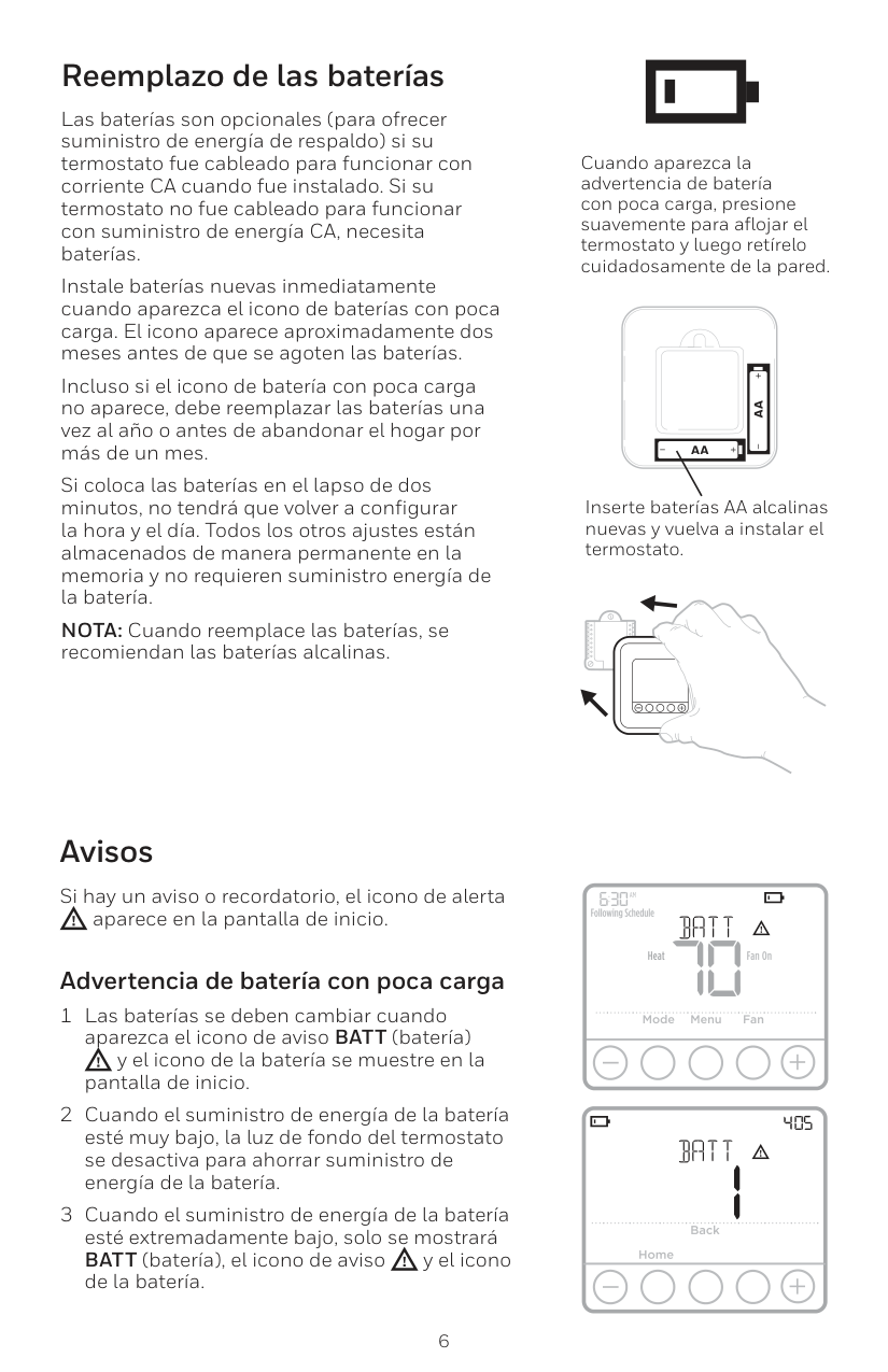 6 Las baterías son opcionales (para ofrecer suministro de energía de respaldo) si su termostato fue cableado para funcionar con corriente CA cuando fue instalado. Si su termostato no fue cableado para funcionar con suministro de energía CA, necesita baterías. Instale baterías nuevas inmediatamente cuando aparezca el icono de baterías con poca carga. El icono aparece aproximadamente dos meses antes de que se agoten las baterías. Incluso si el icono de batería con poca carga no aparece, debe reemplazar las baterías una vez al año o antes de abandonar el hogar por más de un mes. Si coloca las baterías en el lapso de dos minutos, no tendrá que volver a configurar la hora y el día. Todos los otros ajustes están almacenados de manera permanente en la memoria y no requieren suministro energía de la batería. NOTA: Cuando reemplace las baterías, se recomiendan las baterías alcalinas. Reemplazo de las baterías Inserte baterías AA alcalinas nuevas y vuelva a instalar el termostato. Cuando aparezca la advertencia de batería con poca carga, presione suavemente para aflojar el termostato y luego retírelo cuidadosamente de la pared. Avisos Si hay un aviso o recordatorio, el icono de alerta aparece en la pantalla de inicio. Advertencia de batería con poca carga 1 Las baterías se deben cambiar cuando aparezca el icono de aviso BATT (batería) y el icono de la batería se muestre en la pantalla de inicio. 2 Cuando el suministro de energía de la batería esté muy bajo, la luz de fondo del termostato se desactiva para ahorrar suministro de energía de la batería. 3 Cuando el suministro de energía de la batería esté extremadamente bajo, solo se mostrará BATT (batería), el icono de aviso y el icono de la batería.