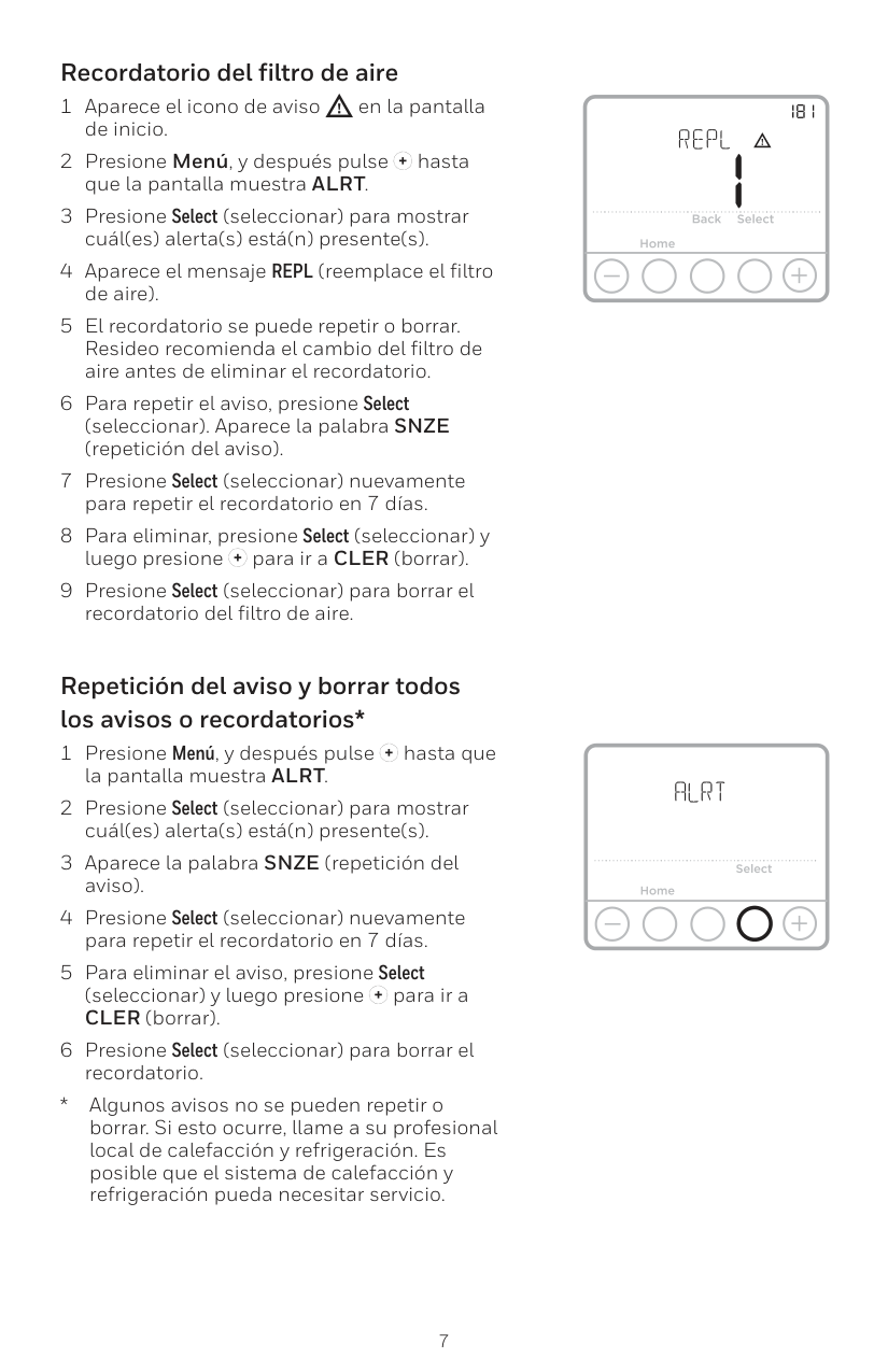 7 Recordatorio del filtro de aire 1 Aparece el icono de aviso en la pantalla de inicio. 2 Presione Menú, y después pulse hasta que la pantalla muestra ALRT. 3 Presione Select (seleccionar) para mostrar cuál(es) alerta(s) está(n) presente(s). 4 Aparece el mensaje REPL (reemplace el filtro de aire). 5 El recordatorio se puede repetir o borrar. Resideo recomienda el cambio del filtro de aire antes de eliminar el recordatorio. 6 Para repetir el aviso, presione Select (seleccionar). Aparece la palabra SNZE (repetición del aviso). 7 Presione Select (seleccionar) nuevamente para repetir el recordatorio en 7 días. 8 Para eliminar, presione Select (seleccionar) y luego presione para ir a CLER (borrar). 9 Presione Select (seleccionar) para borrar el recordatorio del filtro de aire. Repetición del aviso y borrar todos los avisos o recordatorios* 1 Presione Menú, y después pulse hasta que la pantalla muestra ALRT. 2 Presione Select (seleccionar) para mostrar cuál(es) alerta(s) está(n) presente(s). 3 Aparece la palabra SNZE (repetición del aviso). 4 Presione Select (seleccionar) nuevamente para repetir el recordatorio en 7 días. 5 Para eliminar el aviso, presione Select (seleccionar) y luego presione para ir a CLER (borrar). 6 Presione Select (seleccionar) para borrar el recordatorio.
