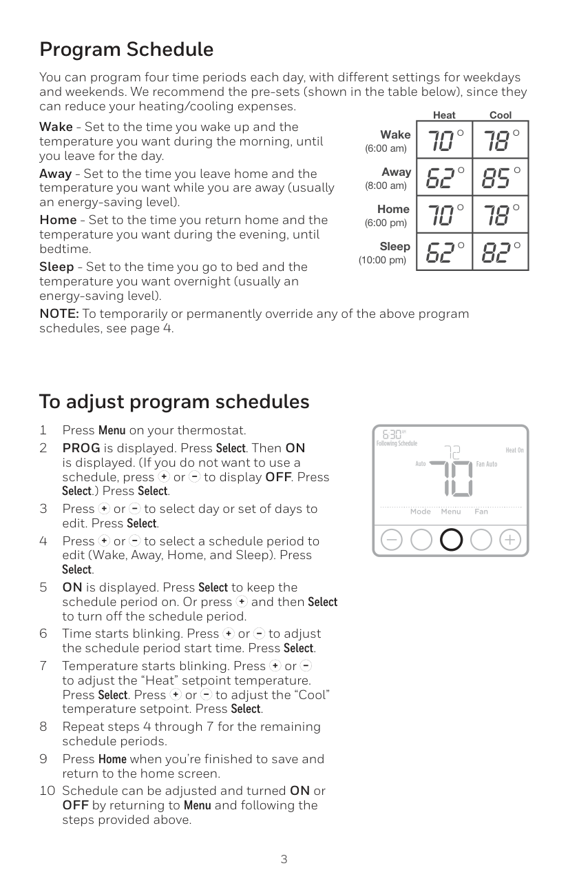 to adjust the “Heat” setpoint temperature. Press Select. Press or to adjust the “Cool” temperature setpoint. Press Select. 8 Repeat steps 4 through 7 for the remaining schedule periods. 9 Press Home when you’re finished to save and return to the home screen. 10 Schedule can be adjusted and turned ON or OFF by returning to Menu and following the steps provided above. Heat Cool Wake (6:00 am) 70 ° 78 ° Away (8:00 am) 62 ° 85 ° Home (6:00 pm) 70 ° 78 ° Sleep (10:00 pm) 62 ° 82 °