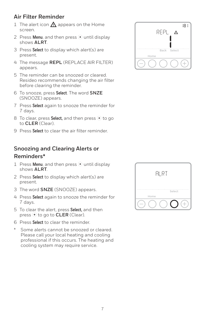 7 Air Filter Reminder 1 The alert icon appears on the Home screen. 2 Press Menu, and then press until display shows ALRT. 3 Press Select to display which alert(s) are present. 4 The message REPL (REPLACE AIR FILTER) appears. 5 The reminder can be snoozed or cleared. Resideo recommends changing the air filter before clearing the reminder. 6 To snooze, press Select. The word SNZE (SNOOZE) appears. 7 Press Select again to snooze the reminder for 7 days. 8 To clear, press Select, and then press to go to CLER (Clear). 9 Press Select to clear the air filter reminder. Snoozing and Clearing Alerts or Reminders* 1 Press Menu, and then press until display shows ALRT. 2 Press Select to display which alert(s) are present. 3 The word SNZE (SNOOZE) appears. 4 Press Select again to snooze the reminder for 7 days. 5 To clear the alert, press Select, and then press to go to CLER (Clear). 6 Press Select to clear the reminder.