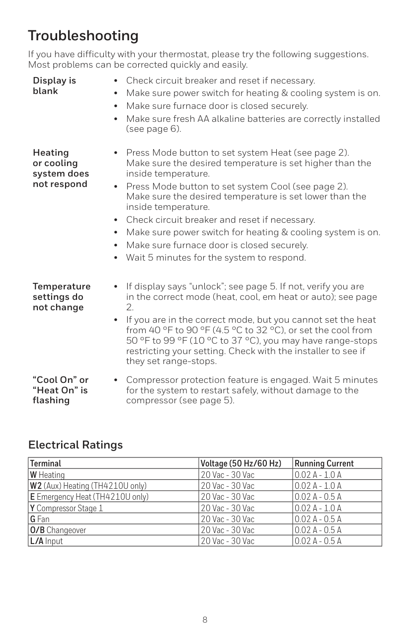 8 Troubleshooting If you have difficulty with your thermostat, please try the following suggestions. Most problems can be corrected quickly and easily. Display is blank
