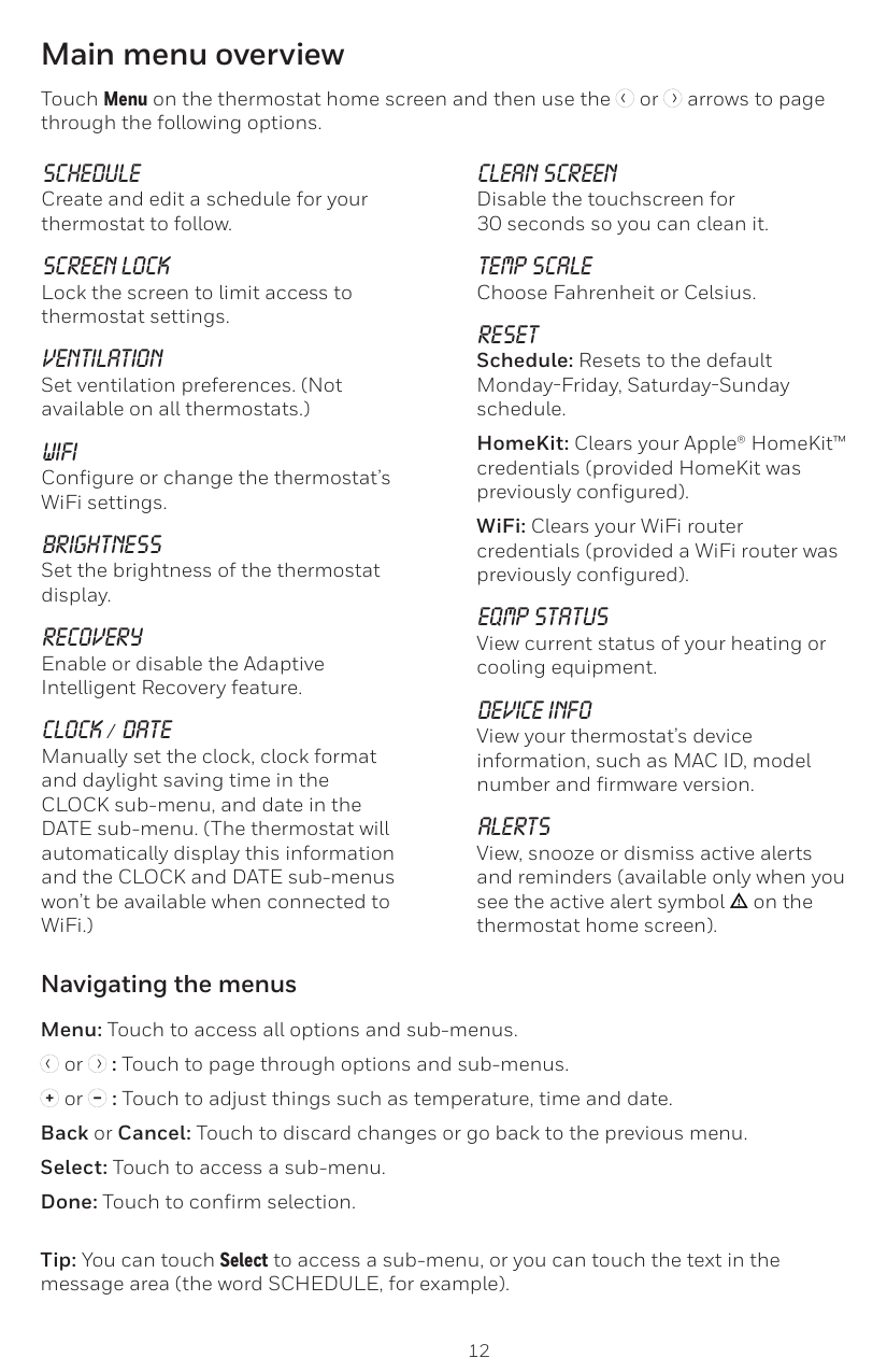 Vea, posponga o cancele las alertas y los recordatorios activos (disponibles solo cuando usted vea el símbolode alerta en la pantalla de inicio del termostato). Navegación por los menús Menu (Menú): presione para acceder a todas las opciones y todos los submenús. o : presione para ver todas las opciones y todos los submenús. o : presione para ajustar, por ejemplo, la temperatura, la hora y la fecha. Back (Atrás) o Cancel (Cancelar): presione para descartar cambios o volver al menú anterior. Select (Seleccionar): presione para acceder a un submenú. Done (Listo): presione para confirmar una selección. Sugerencia: puede presionar Select (Seleccionar) para acceder a un submenú o puede presionar el texto del área de mensajes (la palabra SCHEDULE [PROGRAMA], por ejemplo).