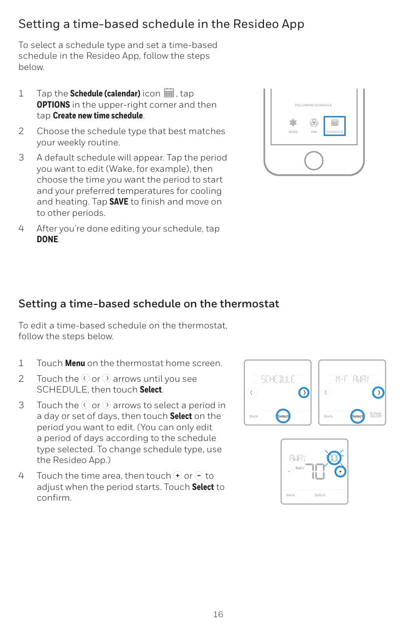 Configurar un programa por tiempo en la aplicación Resideo Back Select Back Select Sched. On/Off Para seleccionar un tipo de programa y configurar un programa por tiempo en la aplicación Resideo, siga los siguientes pasos. 1 Toque el ícono Schedule (calendar) [Programación (calendario)], toque OPTIONS (Opciones) que se encuentra en la esquina superior derecha y, luego, toque Create New Schedule (Crear una nueva programación). 2 Elija el schedule type (tipo de programación) que mejor se adapte a su rutina semanal. 3 Aparecerá un programa predeterminado. Presione el período que desea modificar (activo, por ejemplo) y, luego, elija la hora en que desea que comience ese período y sus temperaturas preferidas para la refrigeración y la calefacción. Presione SAVE (GUARDAR) para terminar y seguir con los demás períodos. 4 Cuando haya terminado de modificar su programa, presione Done. Modificar un programa por tiempo en el termostato Para modificar un programa por tiempo en el termostato, siga los pasos a continuación. 1 Presione Menu (Menú) en la pantalla de inicio del termostato. 2 Presione las flechas o hasta que vea SCHEDULE (PROGRAMA) y, luego, presione Select (Seleccionar). 3 Presione las flechas o para seleccionar un período en el día o conjunto de días y, luego, presione Select (Seleccionar) en el período que desea modificar. (Solo puede modificar un período de días según el tipo de programa seleccionado. Para cambiar el tipo de programa, use la aplicación Resideo). 4 Presione el área de la hora y, luego, presione o para ajustar el inicio del período. Presione Select (Seleccionar) para confirmar.