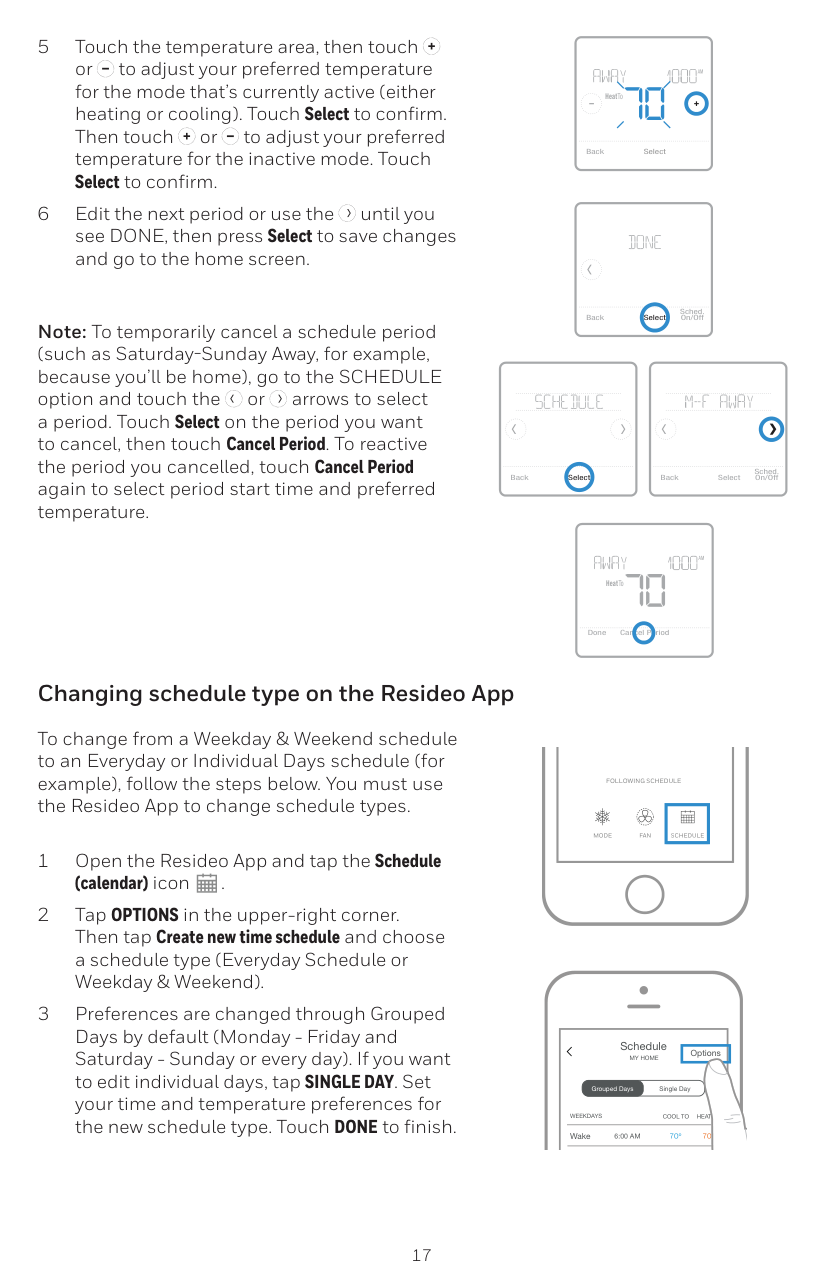 HeatTo Back Select Cambiar el tipo de programa Para cambiar de un programa para días de la semana y del fin de semana a un programa para todos los días o para días individuales, por ejemplo, siga los siguientes pasos. Para cambiar el tipo de programa, debe usar la aplicación Resideo. 1 Abra la aplicación Resideo y presione el ícono de Schedule (calendar) [Programación (calendario)]. 2 Presione OPTIONS (Opciones) en la esquina superior derecha. Luego, toque Create new time schedule (Crear nueva programación de horarios) y elija un schedule type (tipo de programación) (Programación diaria o día de la semana y fin de semana). 3 Las preferencias se cambian a través de Días agrupados por defecto (lunes a viernes, sábado a domingo o todos los días). Si desea editar días individuales, toque SINGLE DAY (Día único). Configure sus preferencias de hora y temperatura para el nuevo schedule type (tipo de programación). Toque DONE (Listo) para terminar. Back Select Back Select Sched. On/OffAm
