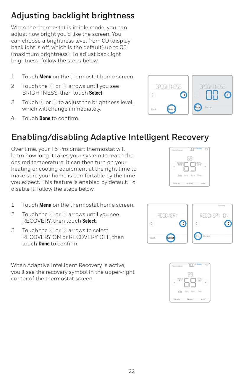 Cuando el termostato se encuentra en modo inactivo, usted puede ajustar el brillo de la pantalla como prefiera. Puede elegir un nivel de brillo desde 00 (la luz de fondo de la pantalla se encuentra apagada, que es la configuración predeterminada) hasta 05 (máximo de brillo). Para ajustar el brillo de la luz de fondo, siga los siguientes pasos. Ajustar el brillo de la luz de fondo Con el tiempo, su termostato T6 Pro con conexión inteligente recordará cuánto tiempo le lleva al sistema para alcanzar la temperatura deseada. Luego, puede encender su equipo de calefacción o refrigeración en el momento justo para asegurarse de que su hogar le brinde comodidad en el momento que usted espera. Esta función está habilitada de forma predeterminada. Para deshabilitarla, siga los siguientes pasos. 1 Presione Menu (Menú) en la pantalla de inicio del termostato. 2 Presione las flechas o hasta que vea RECOVERY (RECUPERACIÓN) y, luego, presione Select (Seleccionar). 3 Presione las flechas o para seleccionar