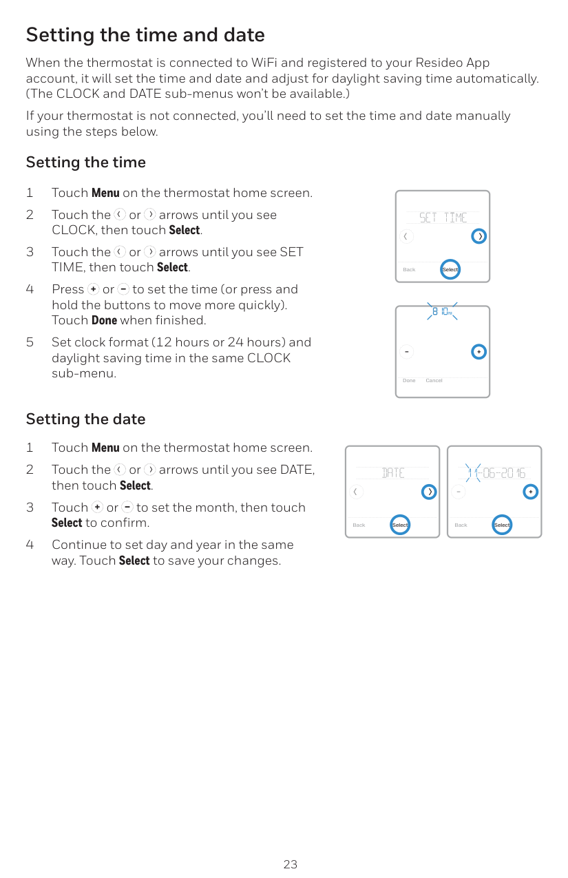 Cuando el termostato esté conectado a WiFi y registrado en su cuenta de la aplicación Resideo, este configurará la hora y la fecha, y realizará ajustes para el horario de ahorro durante las horas de luz de forma automática. (Los submenús CLOCK [RELOJ] y DATE [FECHA] no estarán disponibles). Si su termostato no está conectado, deberá configurar la hora y la fecha manualmente, siguiendo los pasos a continuación. Configurar la fecha y la hora Back Select