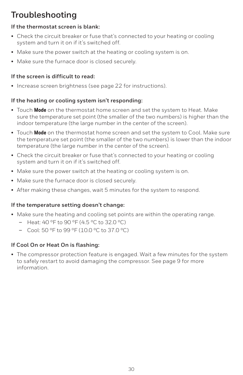 Check the circuit breaker and reset it if necessary. Also make sure the power switch for the heating and cooling system is on, and that the furnace door is closed securely. (Page 2)