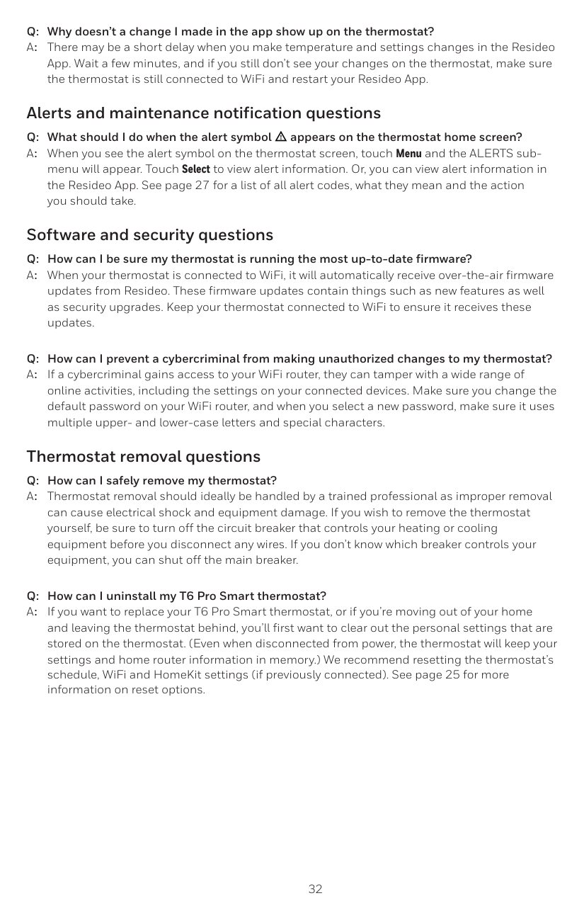 Puede haber una breve demora cuando realiza cambios en la temperatura y las configuraciones a través de la aplicación Resideo. Espere unos minutos y, si todavía no puede ver sus cambios en el termostato, asegúrese de que el termostato siga conectado al WiFi y reinicie su aplicación Resideo. Preguntas frecuentes32