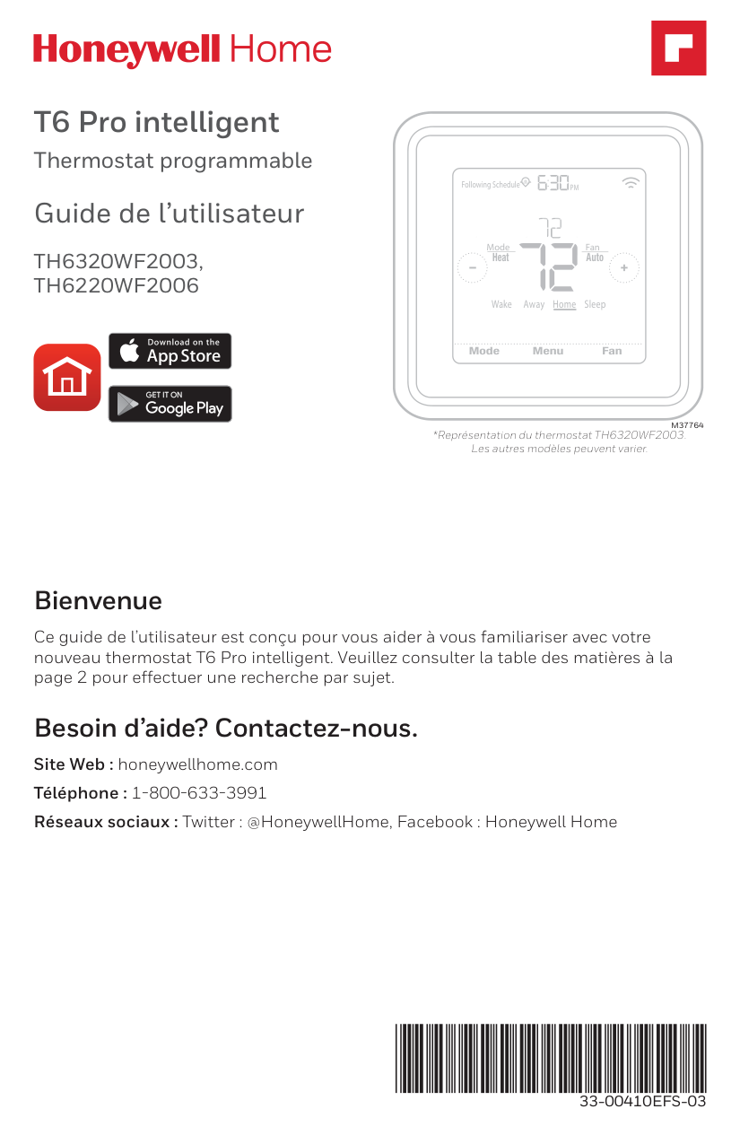This user guide is designed to help you get acquainted with your new T6 Pro Smart thermostat. Check out the table of contents on page 2 to browse by topic. Welcome Web: honeywellhome.com Phone: 1-800-633-3991 Social: Twitter: @HoneywellHome, Facebook: Honeywell Home Need help? Get in touch.2