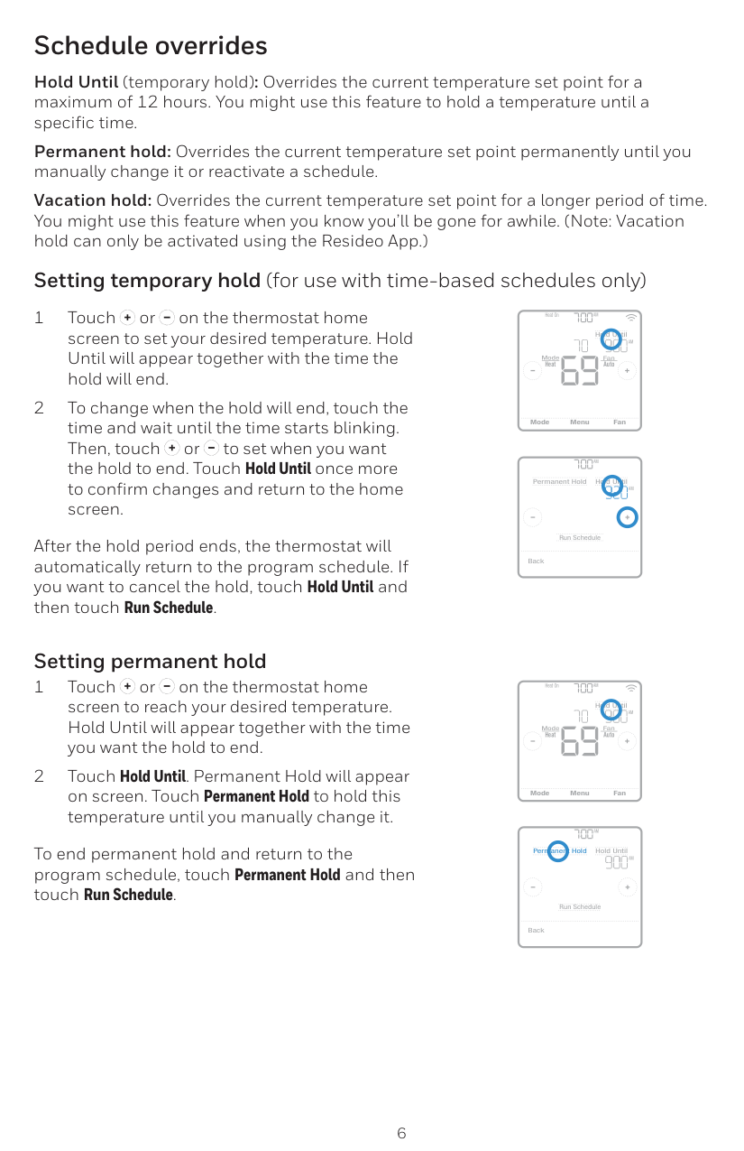 Schedule overrides Hold Until (temporary hold): Overrides the current temperature set point for a maximum of 12 hours. You might use this feature to hold a temperature until a specific time. Permanent hold: Overrides the current temperature set point permanently until you manually change it or reactivate a schedule. Vacation hold: Overrides the current temperature set point for a longer period of time. You might use this feature when you know you’ll be gone for awhile. (Note: Vacation hold can only be activated using the Resideo App.) Setting temporary hold (for use with time-based schedules only) 1 Touch or on the thermostat home screen to set your desired temperature. Hold Until will appear together with the time the hold will end. 2 To change when the hold will end, touch the time and wait until the time starts blinking. Then, touch or to set when you want the hold to end. Touch Hold Until once more to confirm changes and return to the home screen. After the hold period ends, the thermostat will automatically return to the program schedule. If you want to cancel the hold, touch Hold Until and then touch Run Schedule. Setting permanent hold 1 Touch or on the thermostat home screen to reach your desired temperature. Hold Until will appear together with the time you want the hold to end. 2 Touch Hold Until. Permanent Hold will appear on screen. Touch Permanent Hold to hold this temperature until you manually change it. To end permanent hold and return to the program schedule, touch Permanent Hold and then touch Run Schedule.