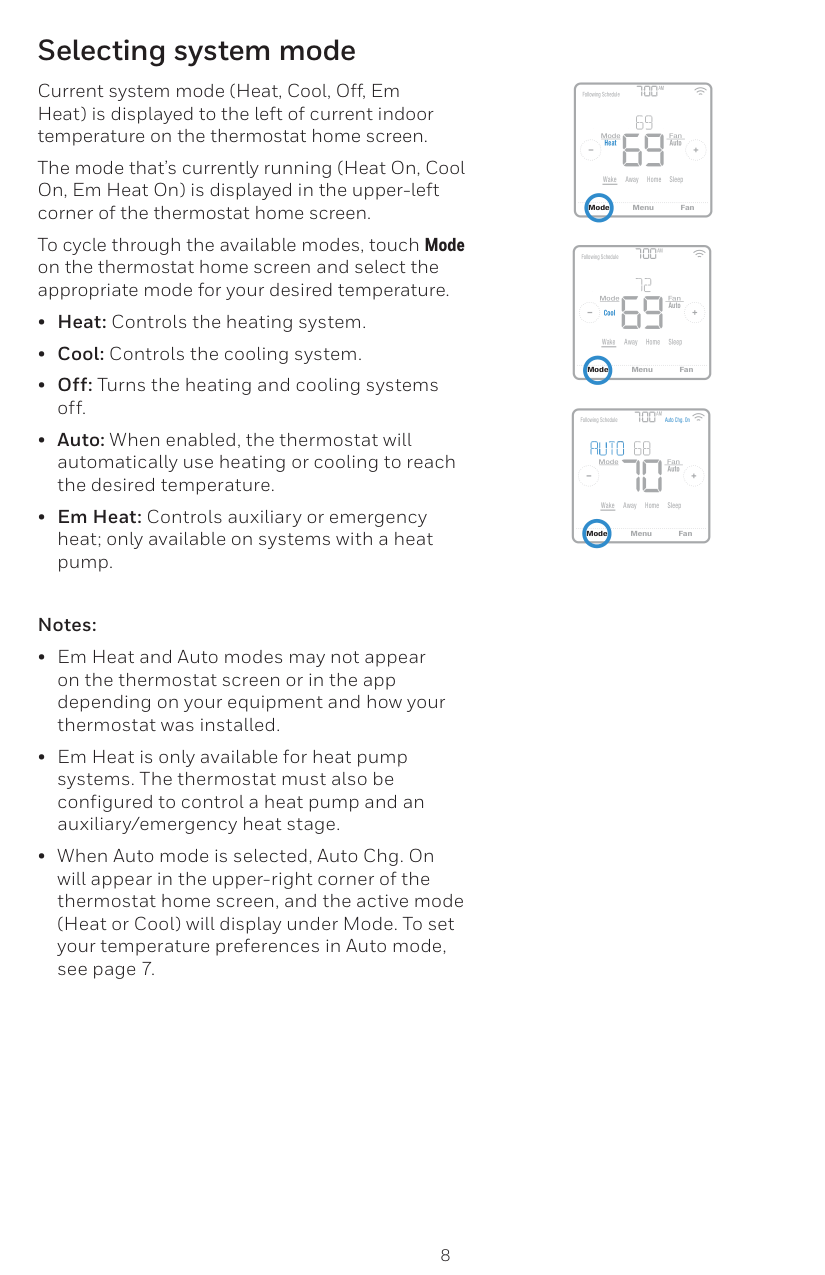 Heat On Menu Fan Mode Fan AutoMode Heat Wake Away Home Sleep Following Schedule Auto Chg. On