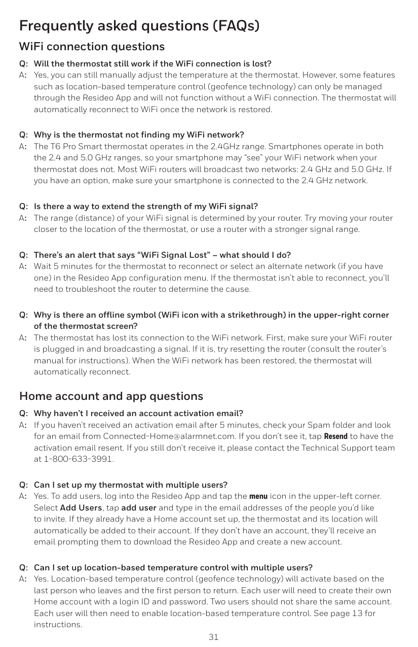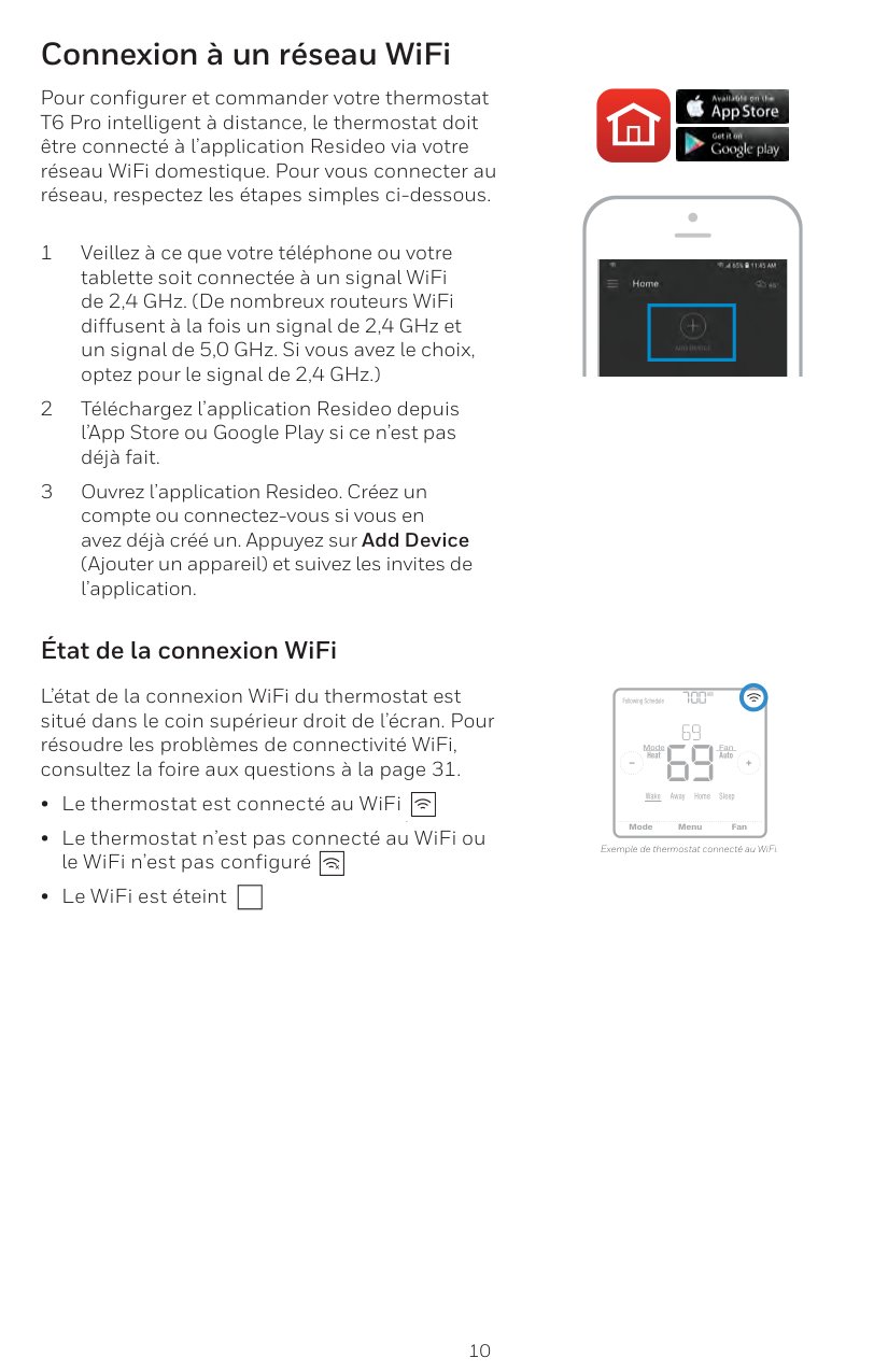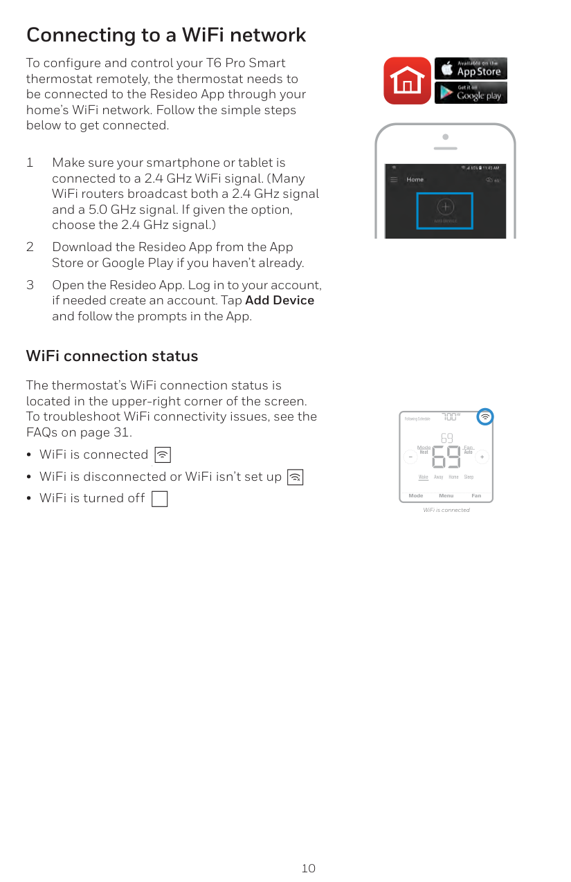 To configure and control your T6 Pro Smart thermostat remotely, the thermostat needs to be connected to the Resideo App through your home’s WiFi network. Follow the simple steps below to get connected. 1 Make sure your smartphone or tablet is connected to a 2.4 GHz WiFi signal. (Many WiFi routers broadcast both a 2.4 GHz signal and a 5.0 GHz signal. If given the option, choose the 2.4 GHz signal.) 2 Download the Resideo App from the App Store or Google Play if you haven’t already. 3 Open the Resideo App. Log in to your account, if needed create an account. Tap Add Device and follow the prompts in the App. WiFi connection status The thermostat’s WiFi connection status is located in the upper-right corner of the screen. To troubleshoot WiFi connectivity issues, see the FAQs on page 31.