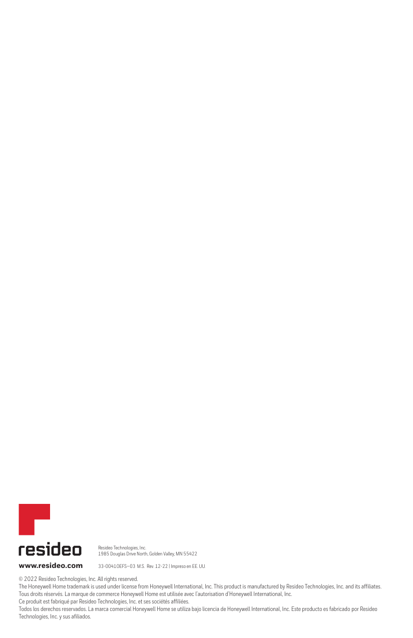AÑOS DE ESTA GARANTÍA. Algunos estados no permiten limitaciones en relación a la duración de una garantía implícita, de manera que la limitación anterior puede no aplicarse en su caso. Esta garantía le otorga derechos legales específicos, pero es posible que usted goce de otros derechos que varían de un estado a otro. Si tiene preguntas acerca de esta garantía, escriba a Resideo Customer Relations, 1985 Douglas Dr. Golden Valley, MN 55422 o llame al 1-800-633-3991.www.resideo.com © 2022 Resideo Technologies, Inc. All rights reserved. The Honeywell Home trademark is used under license from Honeywell International, Inc. This product is manufactured by Resideo Technologies, Inc. and its affiliates. Tous droits réservés. La marque de commerce Honeywell Home est utilisée avec l’autorisation d’Honeywell International, Inc. Ce produit est fabriqué par Resideo Technologies, Inc. et ses sociétés affiliées. Todos los derechos reservados. La marca comercial Honeywell Home se utiliza bajo licencia de Honeywell International, Inc. Este producto es fabricado por Resideo Technologies, Inc. y sus afiliados. Resideo Technologies, Inc. 1985 Douglas Drive North, Golden Valley, MN 55422 33-00410EFS—03 M.S. Rev. 12-22 | Impreso en EE. UU.