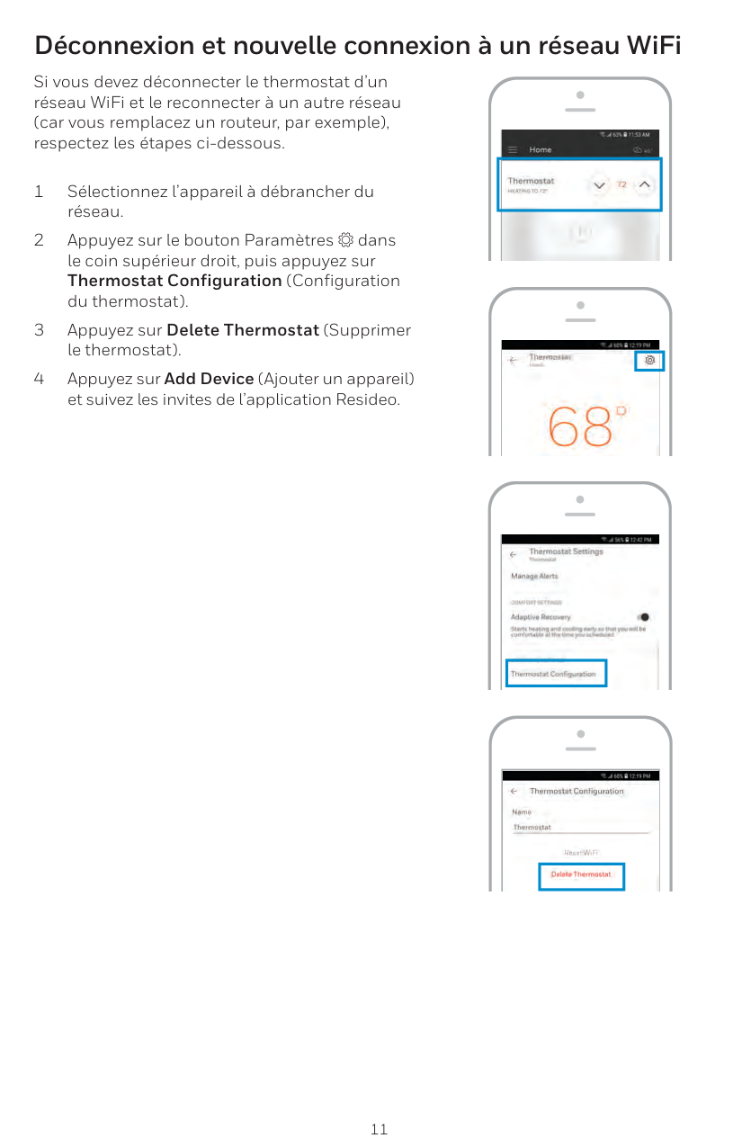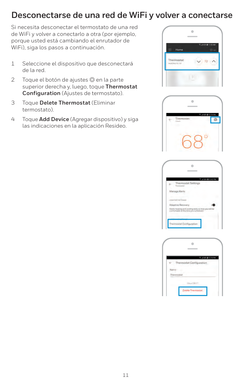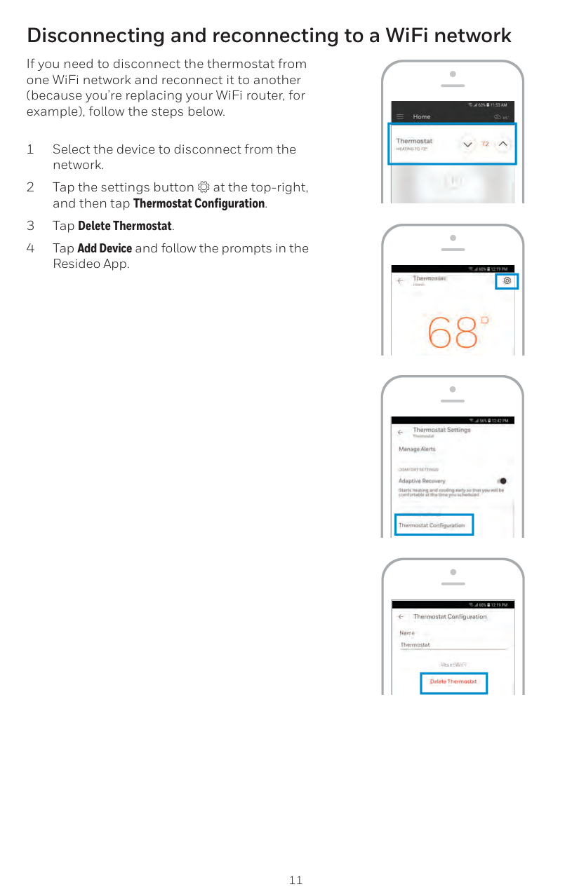 If you need to disconnect the thermostat from one WiFi network and reconnect it to another (because you’re replacing your WiFi router, for example), follow the steps below. 1 Select the device to disconnect from the network. 2 Tap the settings button at the top-right, and then tap Thermostat Configuration. 3 Tap Delete Thermostat. 4 Tap Add Device and follow the prompts in the Resideo App. Disconnecting and reconnecting to a WiFi network