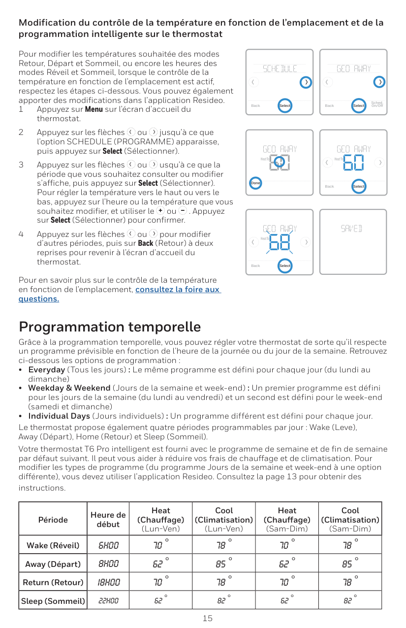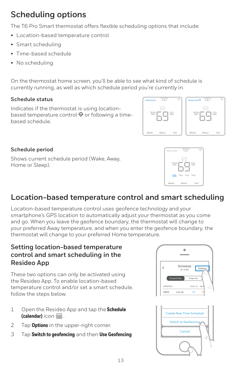Thermostat Features Flexible scheduling: You can choose to use location-based temperature control (geofence technology), program a set schedule or use a combination of both to make sure your home is always comfortable.