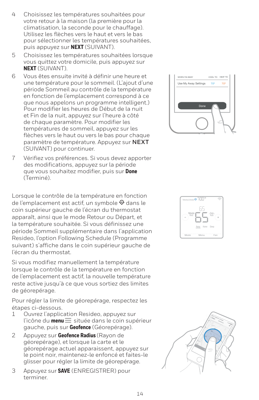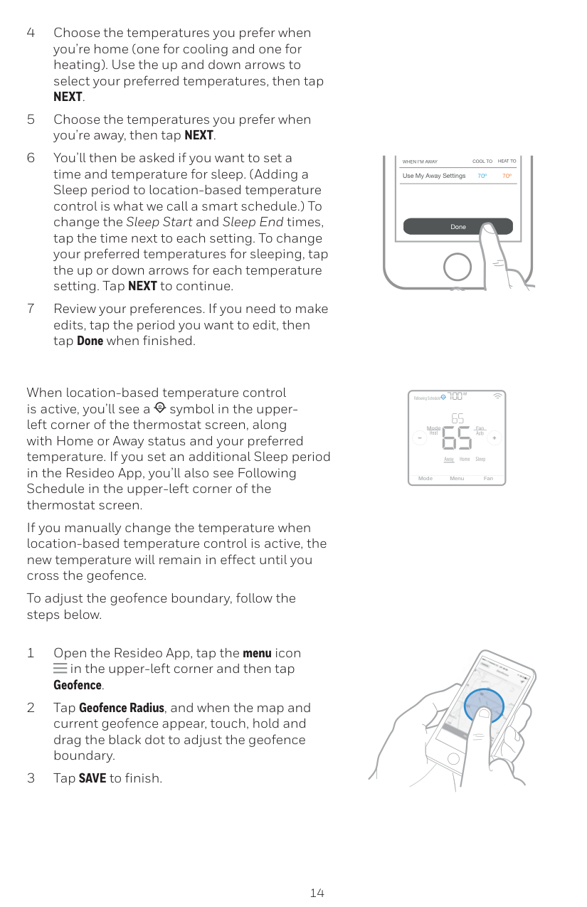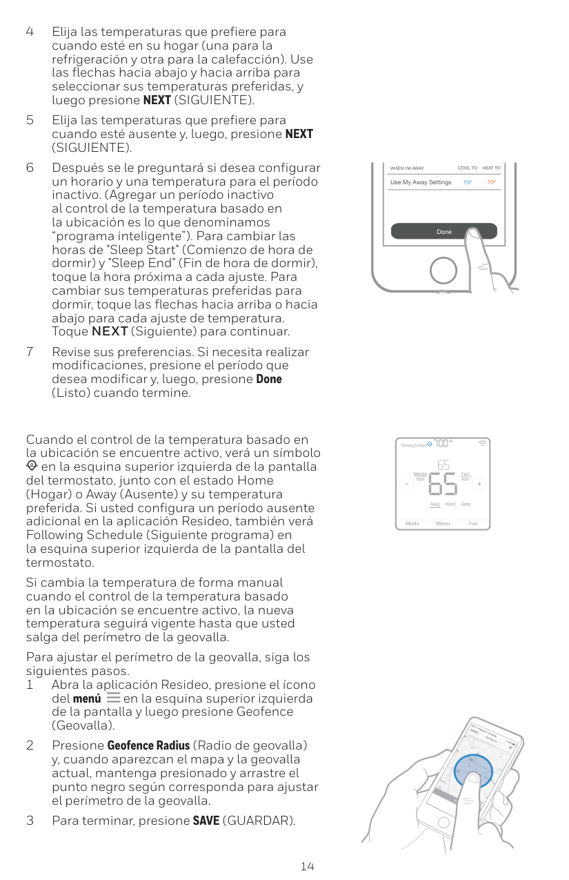 6 Después se le preguntará si desea configurar un horario y una temperatura para el período inactivo. (Agregar un período inactivo al control de la temperatura basado en la ubicación es lo que denominamos “programa inteligente”). Para cambiar las horas de "Sleep Start" (Comienzo de hora de dormir) y "Sleep End" (Fin de hora de dormir), toque la hora próxima a cada ajuste. Para cambiar sus temperaturas preferidas para dormir, toque las flechas hacia arriba o hacia abajo para cada ajuste de temperatura. Toque NEXT (Siguiente) para continuar. 7 Revise sus preferencias. Si necesita realizar modificaciones, presione el período que desea modificar y, luego, presione Done (Listo) cuando termine. Cuando el control de la temperatura basado en la ubicación se encuentre activo, verá un símbolo en la esquina superior izquierda de la pantalla del termostato, junto con el estado Home (Hogar) o Away (Ausente) y su temperatura preferida. Si usted configura un período ausente adicional en la aplicación Resideo, también verá Following Schedule (Siguiente programa) en la esquina superior izquierda de la pantalla del termostato. Si cambia la temperatura de forma manual cuando el control de la temperatura basado en la ubicación se encuentre activo, la nueva temperatura seguirá vigente hasta que usted salga del perímetro de la geovalla. Para ajustar el perímetro de la geovalla, siga los siguientes pasos. 1 Abra la aplicación Resideo, presione el ícono del menú en la esquina superior izquierda de la pantalla y luego presione Geofence (Geovalla). 2 Presione Geofence Radius (Radio de geovalla) y, cuando aparezcan el mapa y la geovalla actual, mantenga presionado y arrastre el punto negro según corresponda para ajustar el perímetro de la geovalla. 3 Para terminar, presione SAVE (GUARDAR).Am