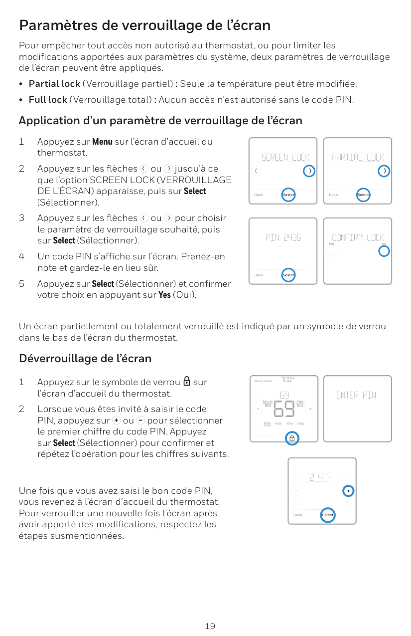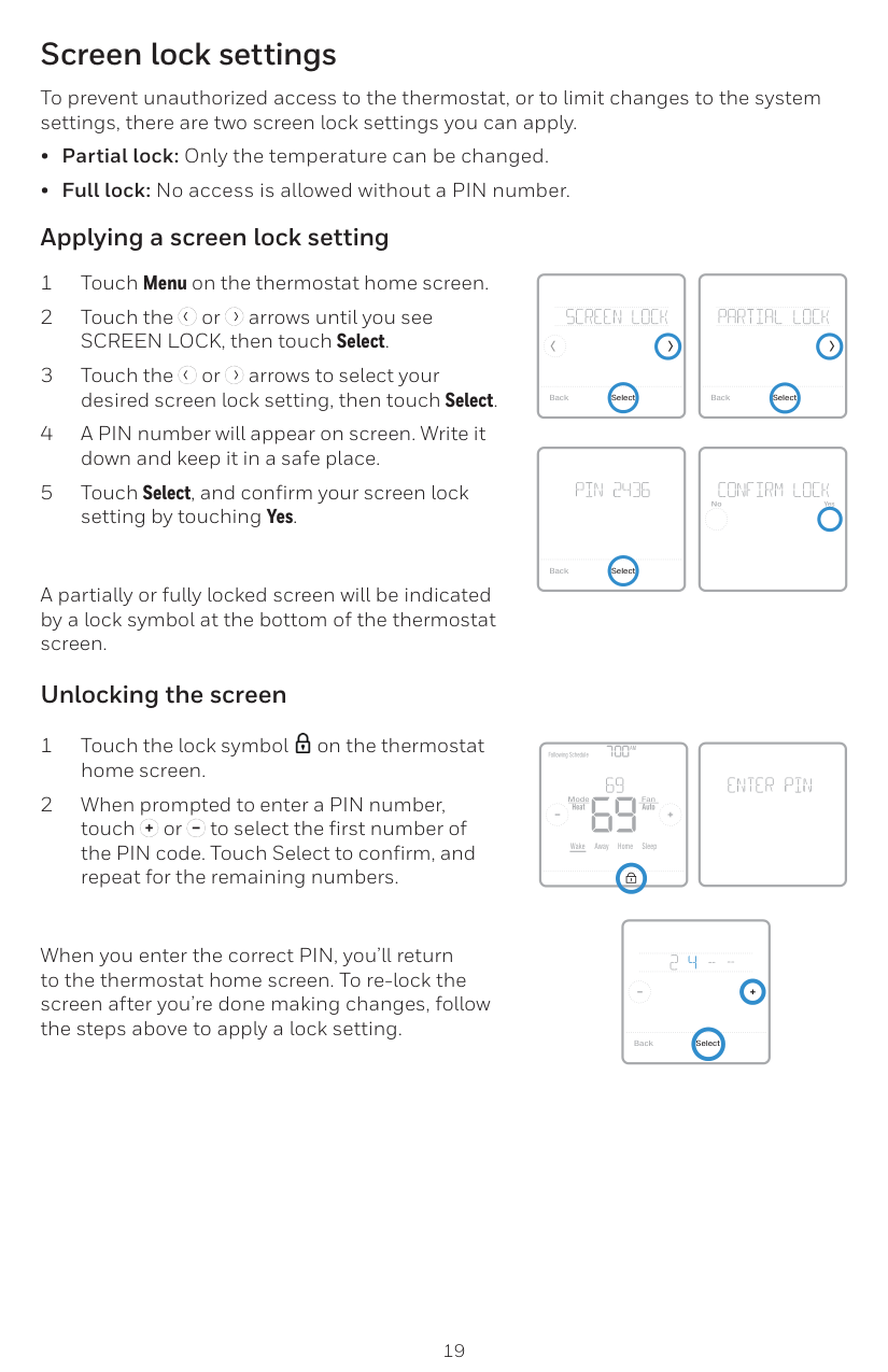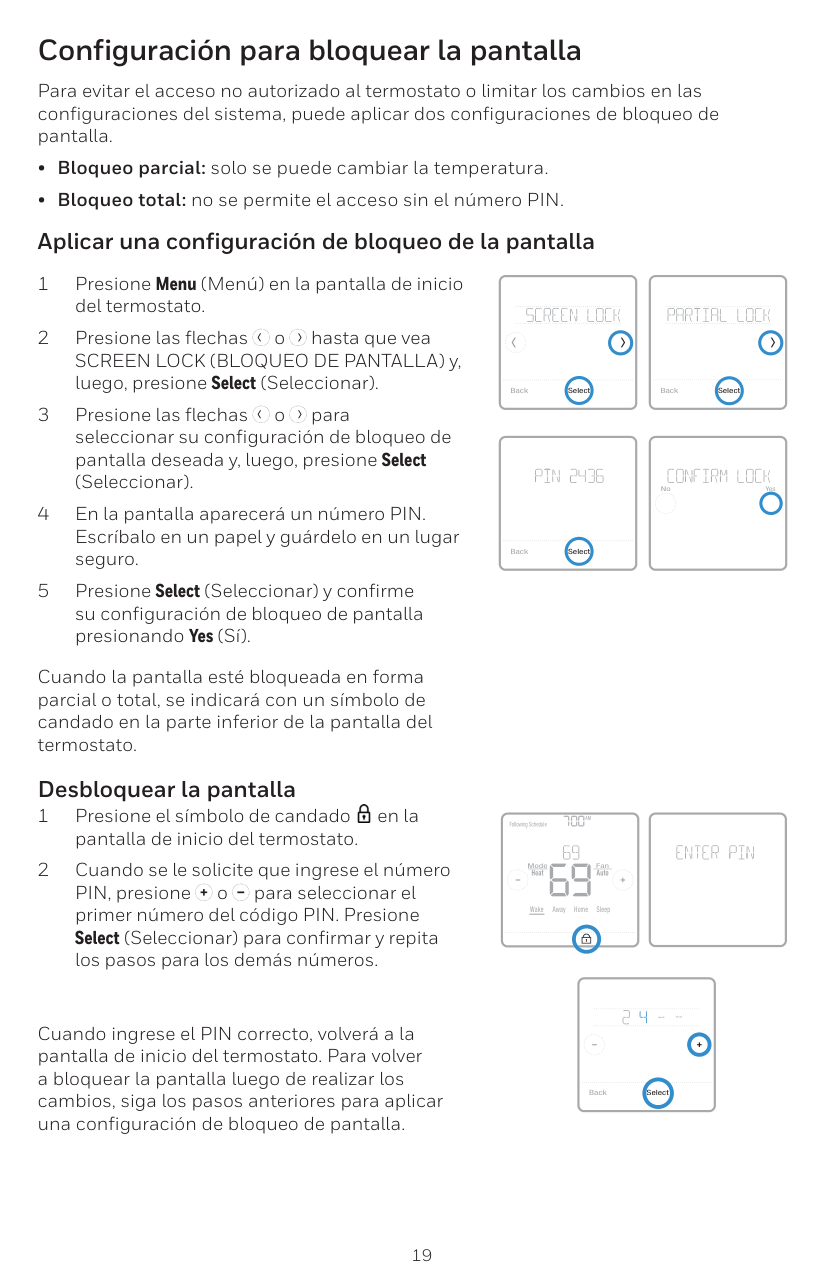Fan Auto Mode Heat Wake Away Home Sleep Following Schedule Aplicar una configuración de bloqueo de la pantalla 1 Presione Menu (Menú) en la pantalla de inicio del termostato. 2 Presione las flechas o hasta que vea SCREEN LOCK (BLOQUEO DE PANTALLA) y, luego, presione Select (Seleccionar). 3 Presione las flechas o para seleccionar su configuración de bloqueo de pantalla deseada y, luego, presione Select (Seleccionar). 4 En la pantalla aparecerá un número PIN. Escríbalo en un papel y guárdelo en un lugar seguro. 5 Presione Select (Seleccionar) y confirme su configuración de bloqueo de pantalla presionando Yes (Sí). Cuando la pantalla esté bloqueada en forma parcial o total, se indicará con un símbolo de candado en la parte inferior de la pantalla del termostato. Desbloquear la pantalla 1 Presione el símbolo de candado en la pantalla de inicio del termostato. 2 Cuando se le solicite que ingrese el número PIN, presione o para seleccionar el primer número del código PIN. Presione Select (Seleccionar) para confirmar y repita los pasos para los demás números. Cuando ingrese el PIN correcto, volverá a la pantalla de inicio del termostato. Para volver a bloquear la pantalla luego de realizar los cambios, siga los pasos anteriores para aplicar una configuración de bloqueo de pantalla.20