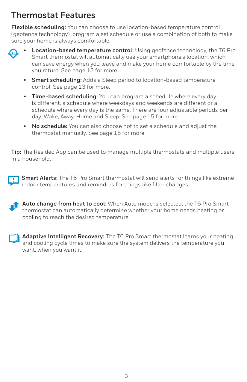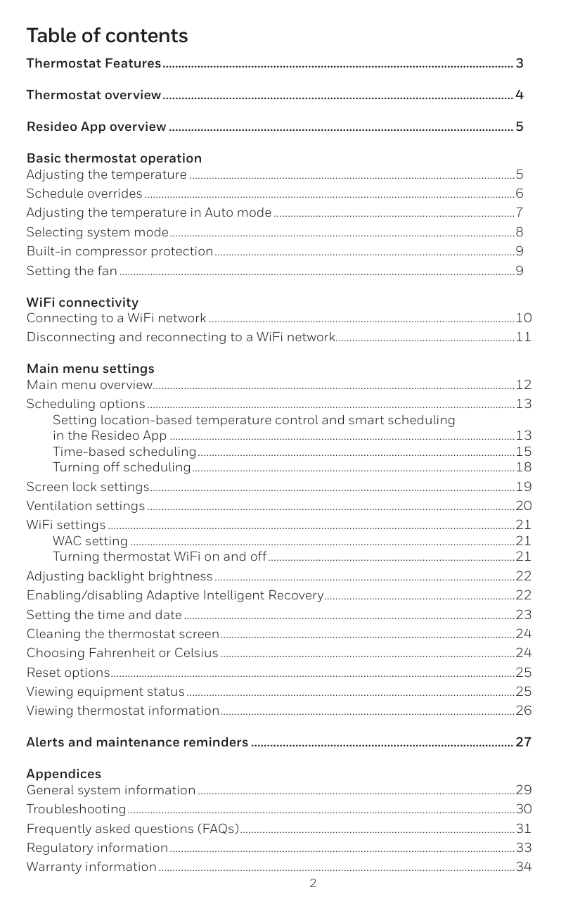 Table of contents Thermostat Features................................................................................................................ 3 Thermostat overview................................................................................................................ 4 Resideo App overview.............................................................................................................. 5 Basic thermostat operation Adjusting the temperature.....................................................................................................................5 Schedule overrides.....................................................................................................................................6 Adjusting the temperature in Auto mode.......................................................................................7 Selecting system mode............................................................................................................................8 Built-in compressor protection............................................................................................................9 Setting the fan..............................................................................................................................................9 WiFi connectivity Connecting to a WiFi network..............................................................................................................10 Disconnecting and reconnecting to a WiFi network................................................................11 Main menu settings Main menu overview..................................................................................................................................12 Scheduling options....................................................................................................................................13