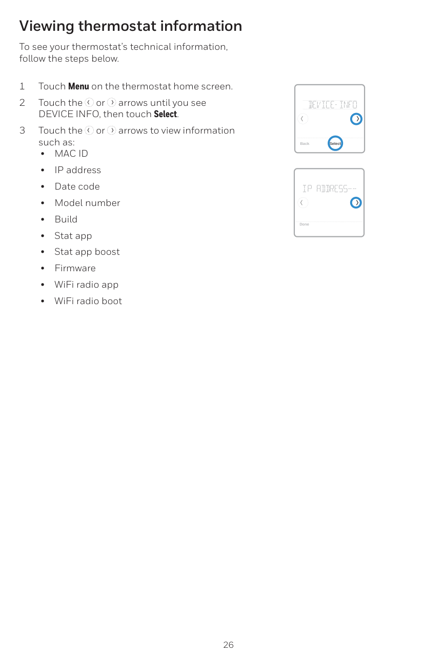 Para ver la información técnica de su termostato, siga los pasos a continuación. 1 Presione Menu (Menú) en la pantalla de inicio del termostato. 2 Presione las flechas o hasta que vea DEVICE INFO (INFORMACIÓN DEL DISPOSITIVO) y, luego, presione Select (Seleccionar). 3 Presione las flechas o para ver la siguiente información, por ejemplo