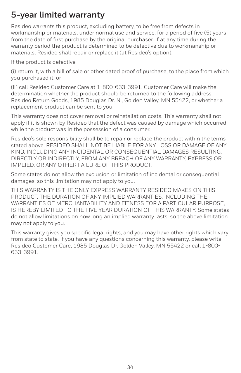Garantía limitada de 5 años Resideo garantiza que este producto, excluyendo la batería, no tiene defectos en la mano de obra ni en los materiales en condiciones de uso y servicio normales durante un período de cinco (5) años desde la fecha de compra por parte del comprador original. Si en cualquier momento, durante el período de vigencia de la garantía, se determina que el producto está defectuoso debido a la mano de obra o los materiales, Resideo lo reparará o reemplazará (a elección de Resideo). Si el producto está defectuoso (i) devuélvalo, con una factura de venta o cualquier otro comprobante de compra con fecha, al lugar donde lo compró; o (ii) llame al Servicio de atención al cliente de Resideo al 1-800-633-3991. En el Servicio de atención al cliente determinarán si el producto debe ser devuelto a la siguiente dirección: Resideo Return Goods, 1985 Douglas Dr. N., Golden Valley, MN 55422, o si se le puede enviar un producto de reemplazo. Esta garantía no cubre los gastos de remoción ni de reinstalación. Esta garantía no se aplicará si Resideo demuestra que el defecto fue causado por daños que se produjeron mientras el producto estuvo en posesión de un consumidor. La única responsabilidad de Resideo será la de reparar o reemplazar el producto según los términos mencionados anteriormente. RESIDEO NO SERÁ RESPONSABLE