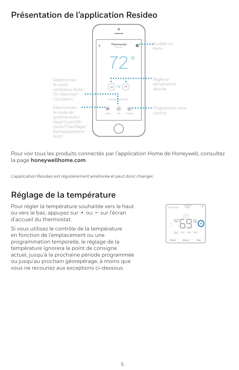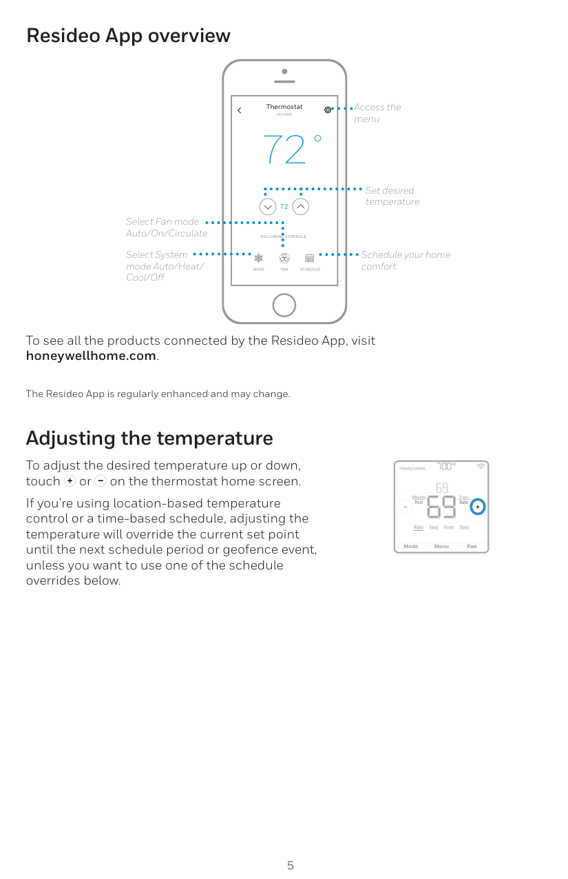 Resideo App overview To see all the products connected by the Resideo App, visit honeywellhome.com. The Resideo App is regularly enhanced and may change. Adjusting the temperature To adjust the desired temperature up or down, touch or on the thermostat home screen. If you’re using location-based temperature control or a time-based schedule, adjusting the temperature will override the current set point until the next schedule period or geofence event, unless you want to use one of the schedule overrides below.