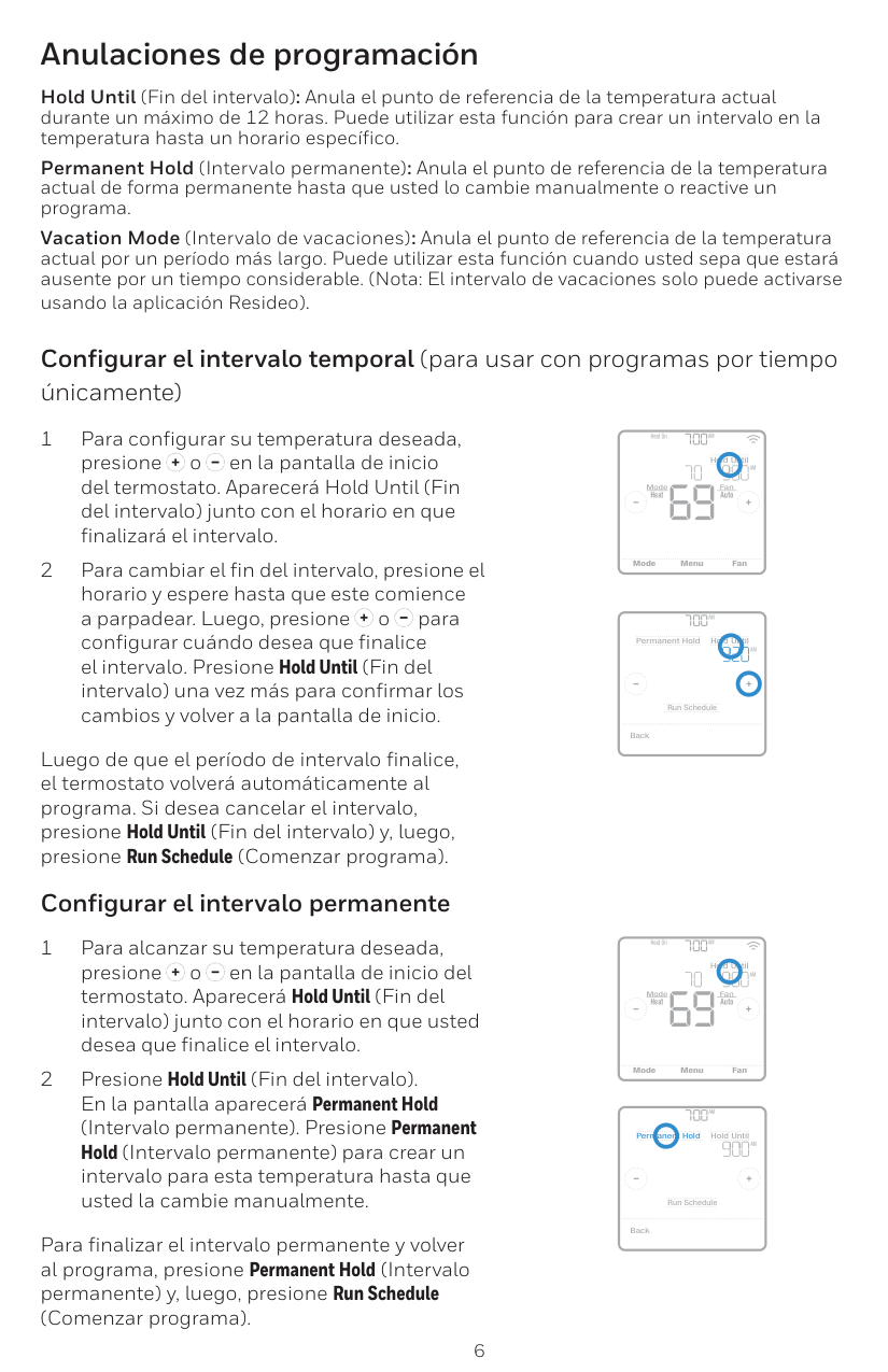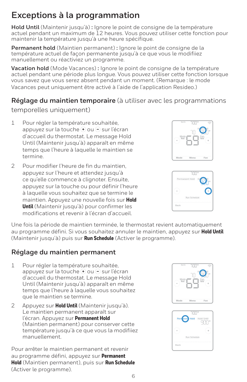 Schedule overrides Hold Until (temporary hold): Overrides the current temperature set point for a maximum of 12 hours. You might use this feature to hold a temperature until a specific time. Permanent hold: Overrides the current temperature set point permanently until you manually change it or reactivate a schedule. Vacation hold: Overrides the current temperature set point for a longer period of time. You might use this feature when you know you’ll be gone for awhile. (Note: Vacation hold can only be activated using the Resideo App.) Setting temporary hold (for use with time-based schedules only) 1 Touch or on the thermostat home screen to set your desired temperature. Hold Until will appear together with the time the hold will end. 2 To change when the hold will end, touch the time and wait until the time starts blinking. Then, touch or to set when you want the hold to end. Touch Hold Until once more to confirm changes and return to the home screen. After the hold period ends, the thermostat will automatically return to the program schedule. If you want to cancel the hold, touch Hold Until and then touch Run Schedule. Setting permanent hold 1 Touch or on the thermostat home screen to reach your desired temperature. Hold Until will appear together with the time you want the hold to end. 2 Touch Hold Until. Permanent Hold will appear on screen. Touch Permanent Hold to hold this temperature until you manually change it. To end permanent hold and return to the program schedule, touch Permanent Hold and then touch Run Schedule.