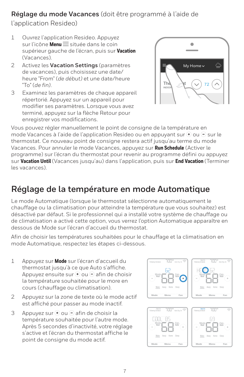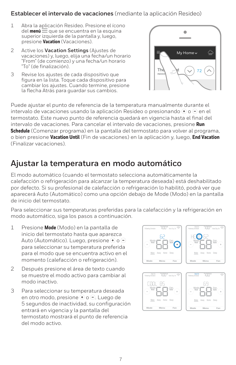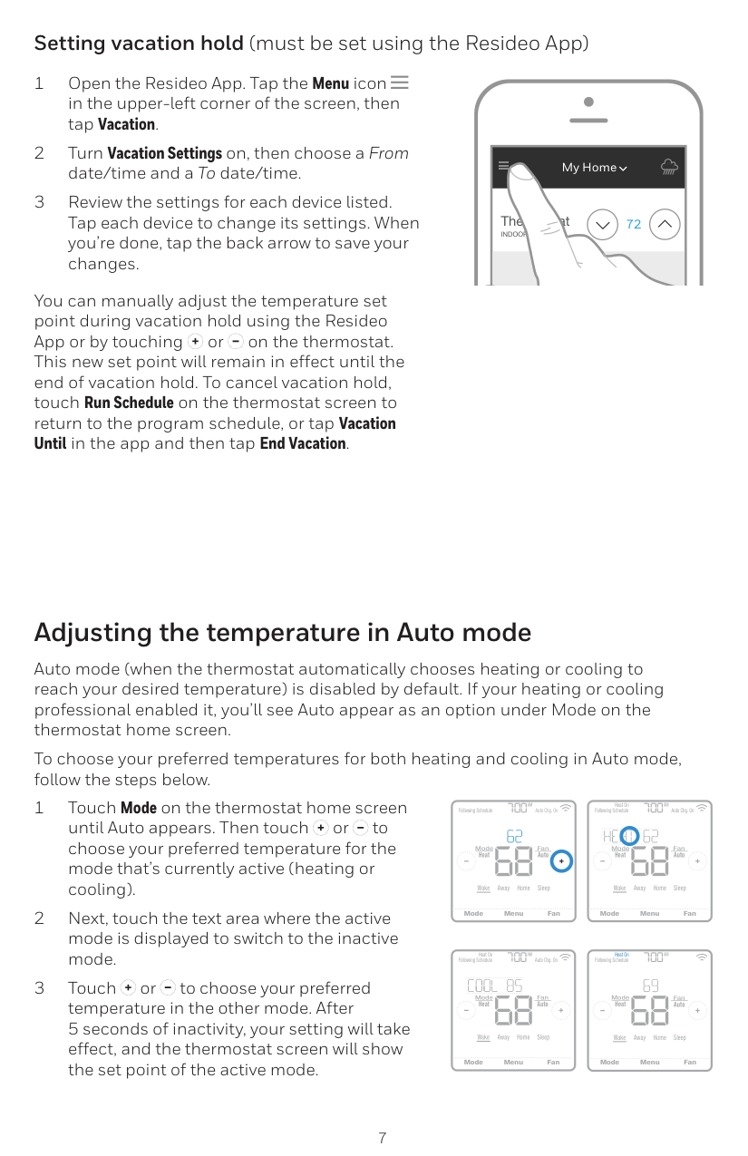 in the upper-left corner of the screen, then tap Vacation. 2 Turn Vacation Settings on, then choose a From date/time and a To date/time. 3 Review the settings for each device listed. Tap each device to change its settings. When you’re done, tap the back arrow to save your changes. You can manually adjust the temperature set point during vacation hold using the Resideo App or by touching or on the thermostat. This new set point will remain in effect until the end of vacation hold. To cancel vacation hold, touch Run Schedule on the thermostat screen to return to the program schedule, or tap Vacation Until in the app and then tap End Vacation. Auto mode (when the thermostat automatically chooses heating or cooling to reach your desired temperature) is disabled by default. If your heating or cooling professional enabled it, you’ll see Auto appear as an option under Mode on the thermostat home screen. To choose your preferred temperatures for both heating and cooling in Auto mode, follow the steps below. Adjusting the temperature in Auto mode
