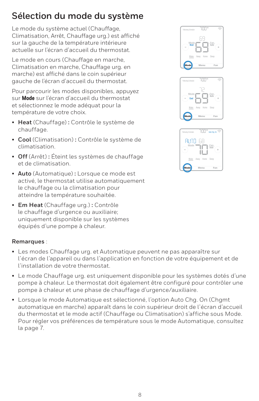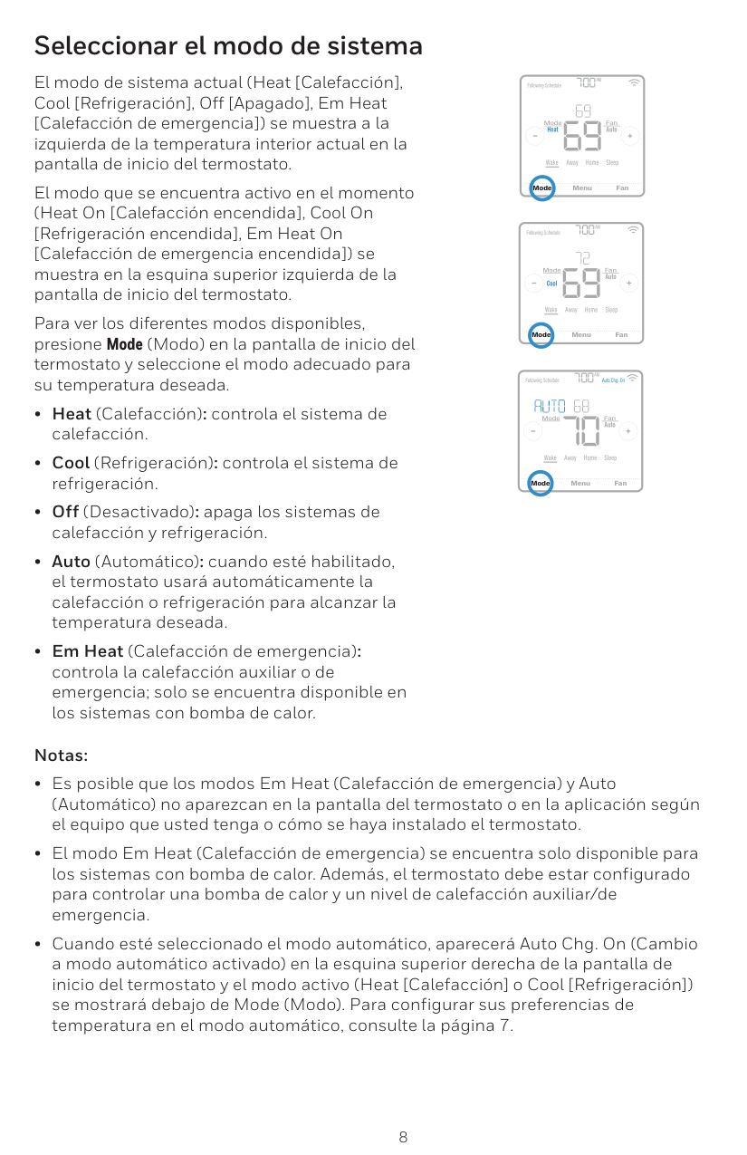 Heat On Menu Fan Mode Fan AutoMode Heat Wake Away Home Sleep Following Schedule 1 Touch Mode on the thermostat home screen until Auto appears. Then touch or to choose your preferred temperature for the mode that’s currently active (heating or cooling). 2 Next, touch the text area where the active mode is displayed to switch to the inactive mode. 3 Touch or to choose your preferred temperature in the other mode. After 5 seconds of inactivity, your setting will take effect, and the thermostat screen will show the set point of the active mode. My Home Thermostat