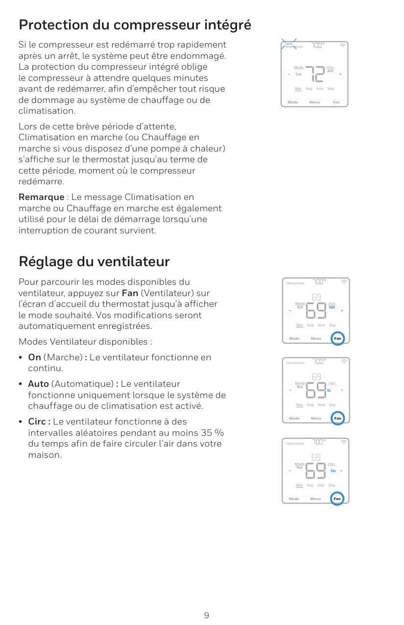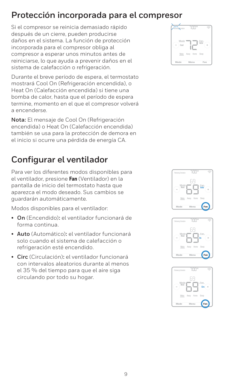 If the compressor is restarted too soon after a shutdown, system damage can occur. The built-in compressor protection feature forces the compressor to wait a few minutes before restarting, helping to prevent damage to the heating or cooling system. During the brief wait period, the thermostat will flash Cool On (or Heat On if you have a heat pump) until the wait period is over, at which point the compressor will turn back on. Note: The flashing Cool On or Heat On message is also used for startup delay protection if AC power loss occurs. Built-in compressor protection Setting the fan Touch Fan on the thermostat home screen to cycle through available fan modes until the desired mode is displayed. Your changes will save automatically. Available fan modes:
