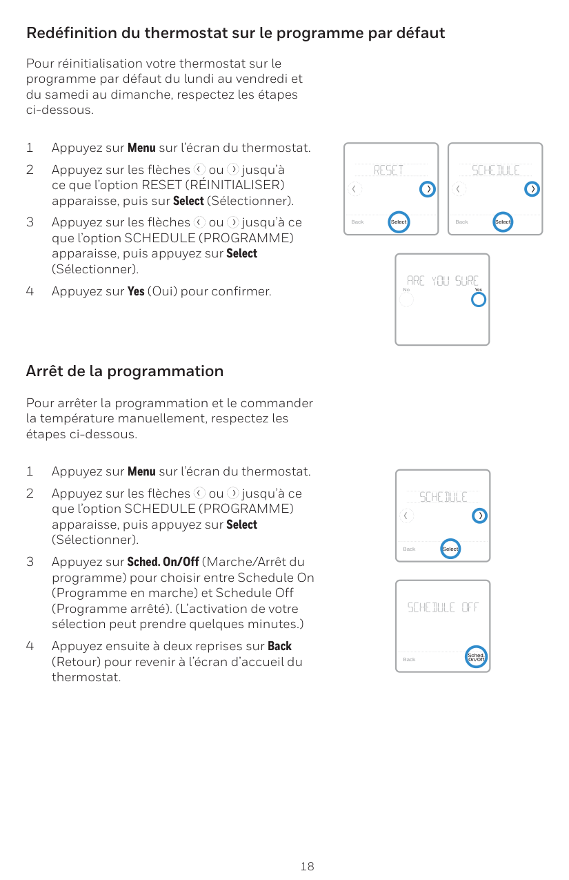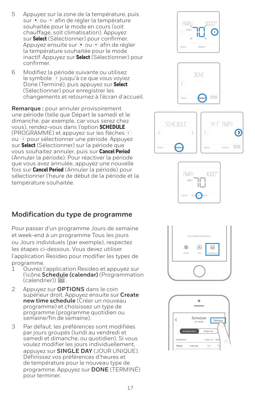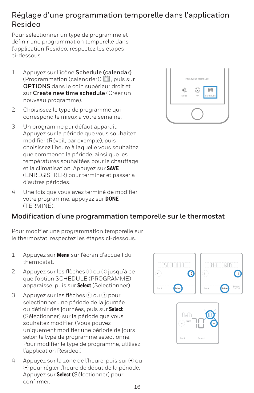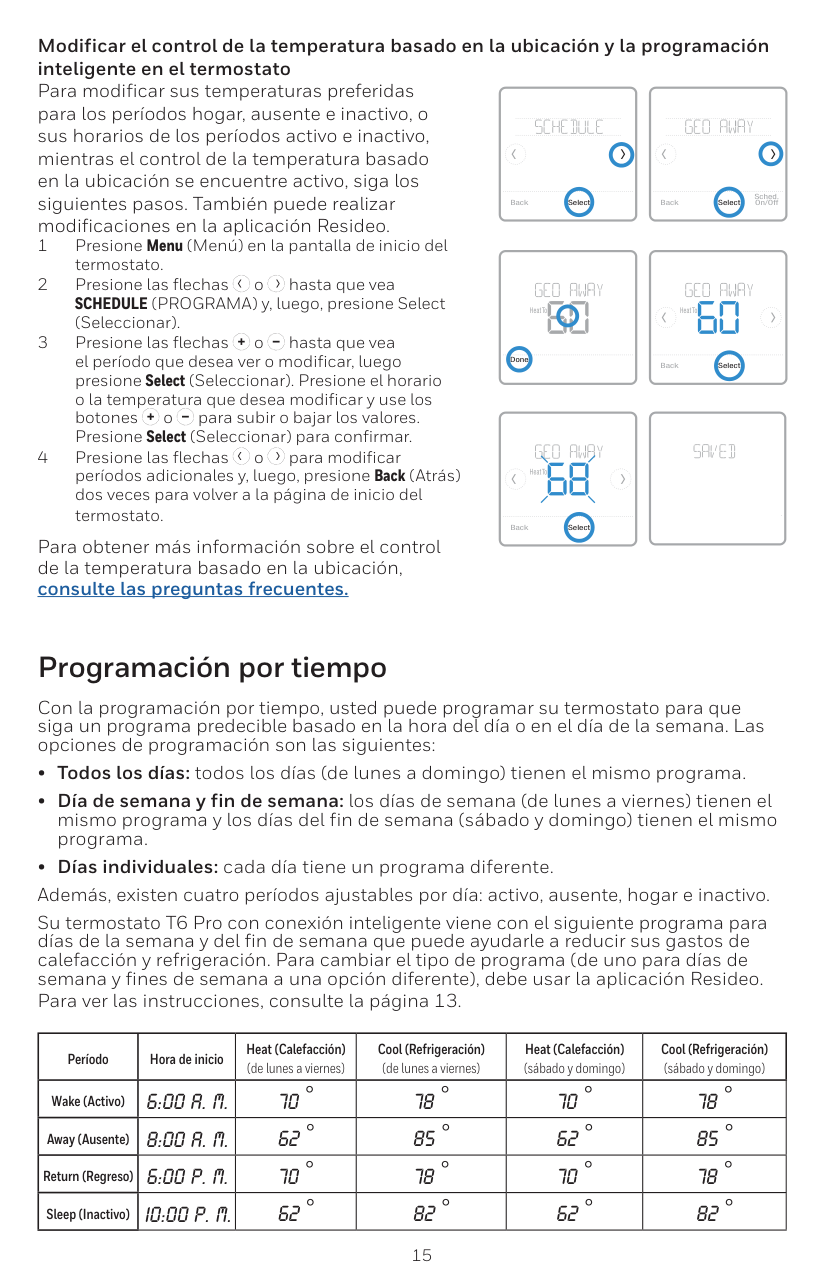 Configurar un programa por tiempo en la aplicación Resideo Back Select Back Select Sched. On/Off Para seleccionar un tipo de programa y configurar un programa por tiempo en la aplicación Resideo, siga los siguientes pasos. 1 Toque el ícono Schedule (calendar) [Programación (calendario)], toque OPTIONS (Opciones) que se encuentra en la esquina superior derecha y, luego, toque Create New Schedule (Crear una nueva programación). 2 Elija el schedule type (tipo de programación) que mejor se adapte a su rutina semanal. 3 Aparecerá un programa predeterminado. Presione el período que desea modificar (activo, por ejemplo) y, luego, elija la hora en que desea que comience ese período y sus temperaturas preferidas para la refrigeración y la calefacción. Presione SAVE (GUARDAR) para terminar y seguir con los demás períodos. 4 Cuando haya terminado de modificar su programa, presione Done. Modificar un programa por tiempo en el termostato Para modificar un programa por tiempo en el termostato, siga los pasos a continuación. 1 Presione Menu (Menú) en la pantalla de inicio del termostato. 2 Presione las flechas o hasta que vea SCHEDULE (PROGRAMA) y, luego, presione Select (Seleccionar). 3 Presione las flechas o para seleccionar un período en el día o conjunto de días y, luego, presione Select (Seleccionar) en el período que desea modificar. (Solo puede modificar un período de días según el tipo de programa seleccionado. Para cambiar el tipo de programa, use la aplicación Resideo). 4 Presione el área de la hora y, luego, presione o para ajustar el inicio del período. Presione Select (Seleccionar) para confirmar.