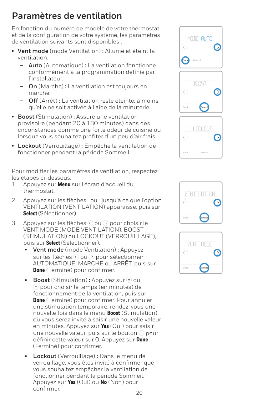 Bloquee la pantalla para limitar el acceso a las configuraciones del termostato.Ventilation (Ventilación)