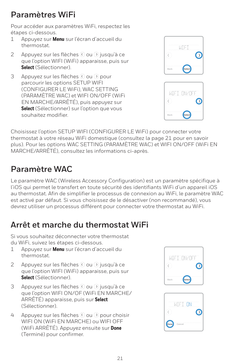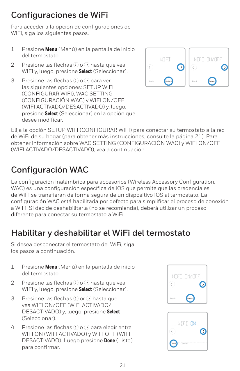 (CONFIGURACIÓN WAC) y WIFI ON/OFF (WIFI ACTIVADO/DESACTIVADO) y, luego, presione Select (Seleccionar) en la opción que desee modificar. Configuraciones de WiFi La configuración inalámbrica para accesorios (Wireless Accessory Configuration, WAC) es una configuración específica de iOS que permite que las credenciales de WiFi se transfieran de forma segura de un dispositivo iOS al termostato. La configuración WAC está habilitada por defecto para simplificar el proceso de conexión a WiFi. Si decide deshabilitarla (no se recomienda), deberá utilizar un proceso diferente para conectar su termostato a WiFi. Configuración WAC Si desea desconectar el termostato del WiFi, siga los pasos a continuación. 1 Presione Menu (Menú) en la pantalla de inicio del termostato. 2 Presione las flechas o hasta que vea WIFI y, luego, presione Select (Seleccionar). 3 Presione las flechas or hasta que vea WIFI ON/OFF (WIFI ACTIVADO/ DESACTIVADO) y, luego, presione Select (Seleccionar). 4 Presione las flechas o para elegir entre WIFI ON (WIFI ACTIVADO) y WIFI OFF (WIFI DESACTIVADO). Luego presione Done (Listo) para confirmar. Habilitar y deshabilitar el WiFi del termostato Back Select Done Cancel Back Select Back Select Elija la opción SETUP WIFI (CONFIGURAR WIFI) para conectar su termostato a la red de WiFi de su hogar (para obtener más instrucciones, consulte la página 21). Para obtener información sobre WAC SETTING (CONFIGURACIÓN WAC) y WIFI ON/OFF (WIFI ACTIVADO/DESACTIVADO), vea a continuación.22