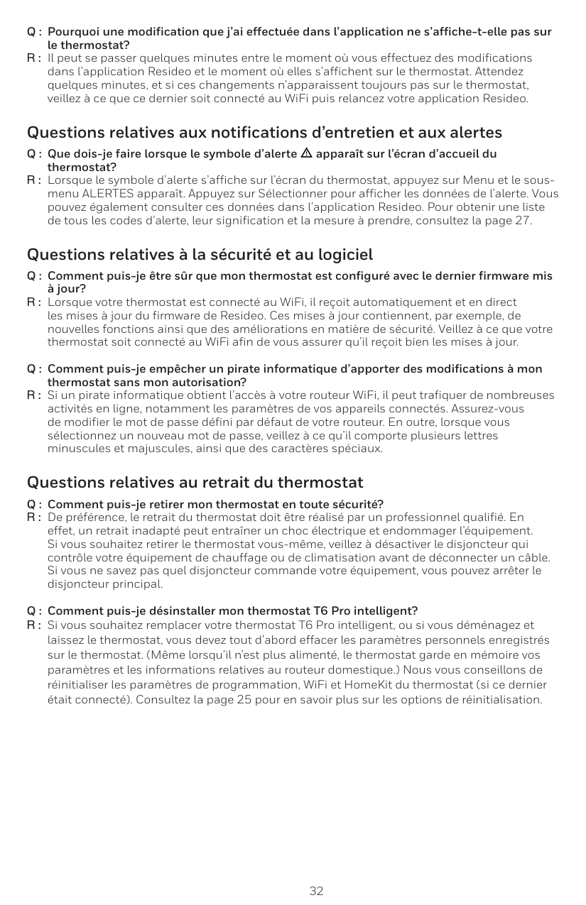 Cuando vea el símbolo de alerta en la pantalla de inicio del termostato, presione Menu (Menú) y, luego, aparecerá el submenú ALERTS (ALERTAS). Para ver la información de la alerta, presione Select (Seleccionar). O bien, puede ver la información de las alertas en la aplicación Resideo. Para ver una lista de todos los códigos de alerta, qué significan y las acciones que debería realizar, consulte la página 27. Preguntas sobre software y seguridad :P